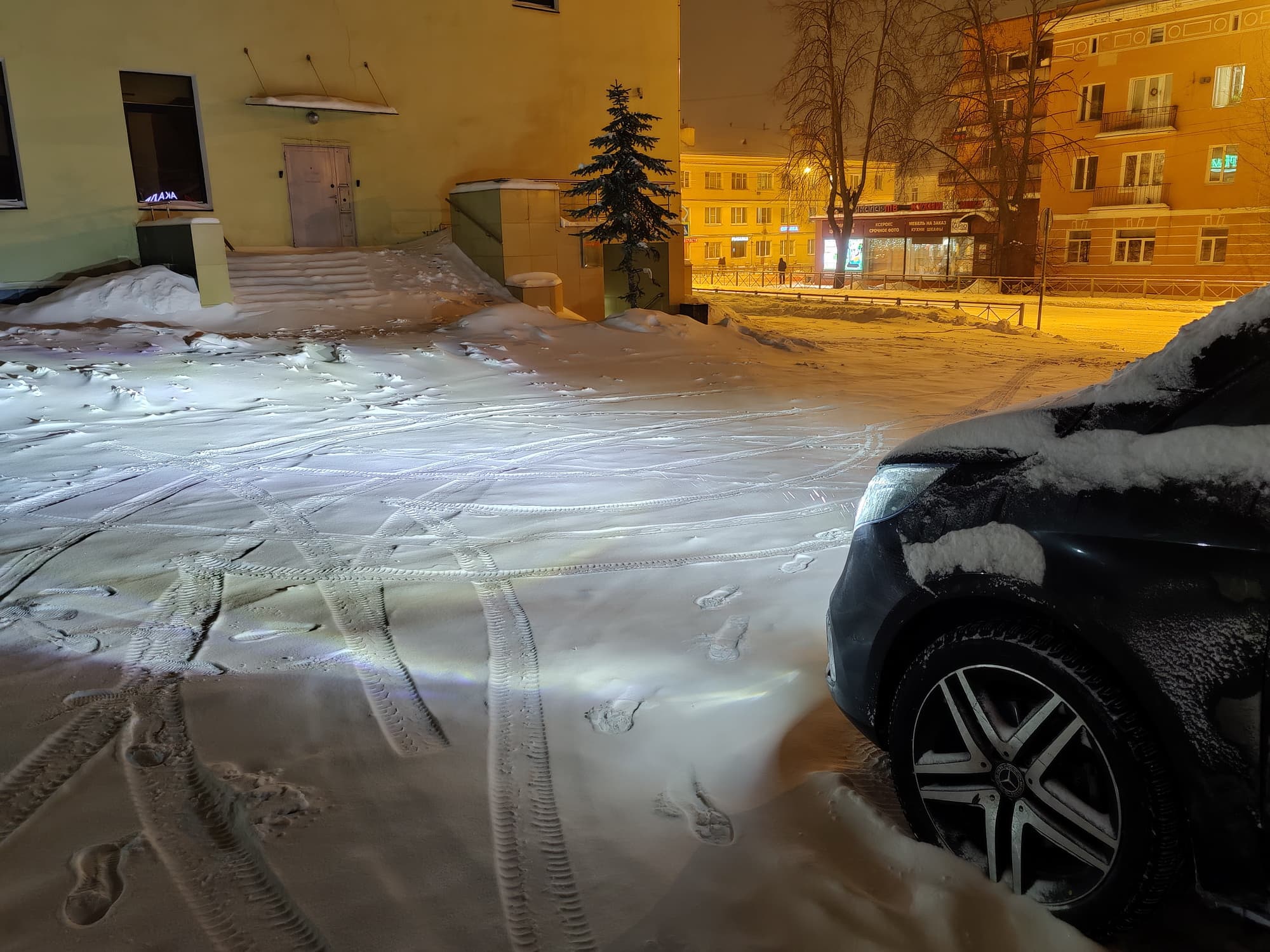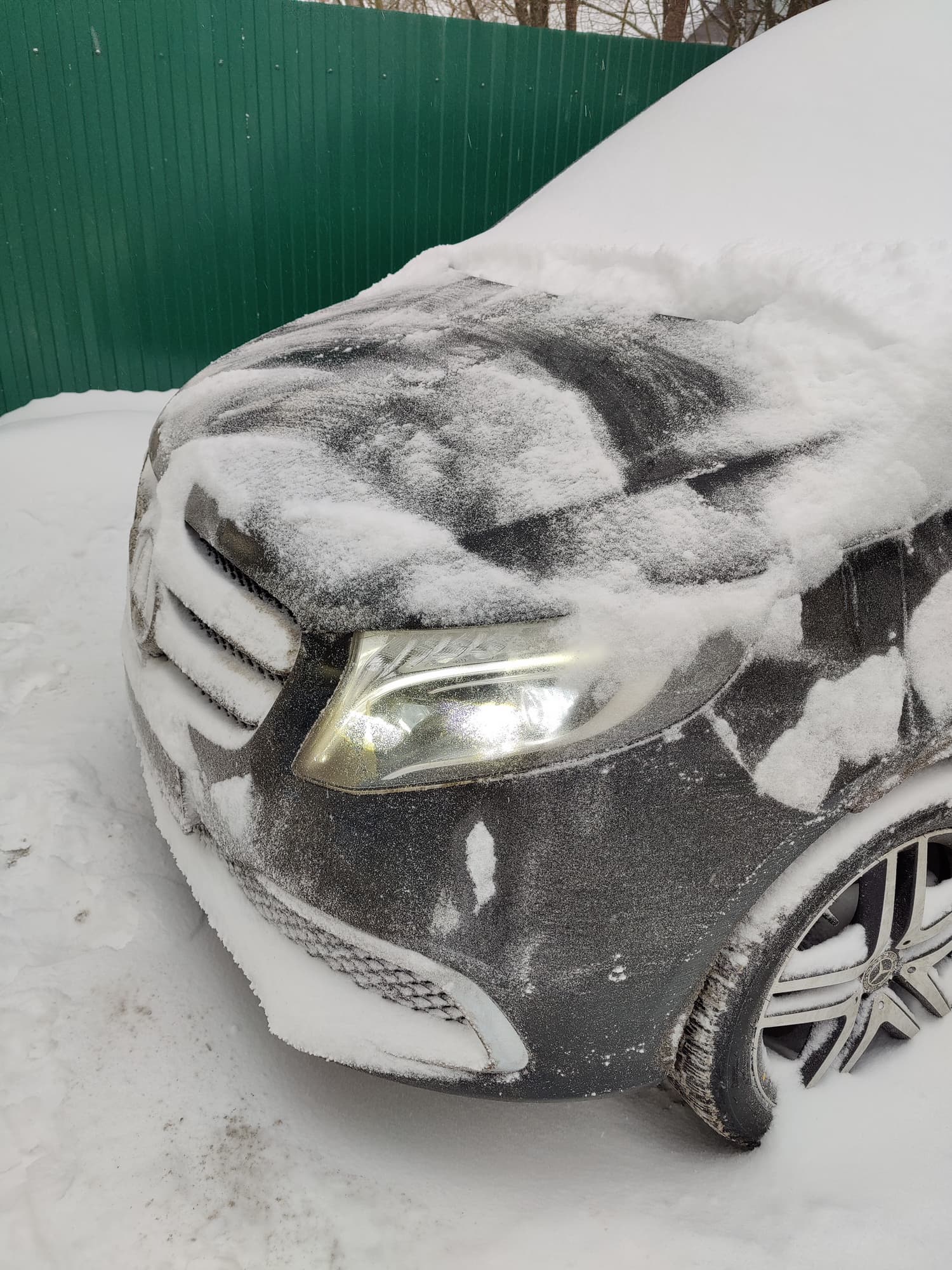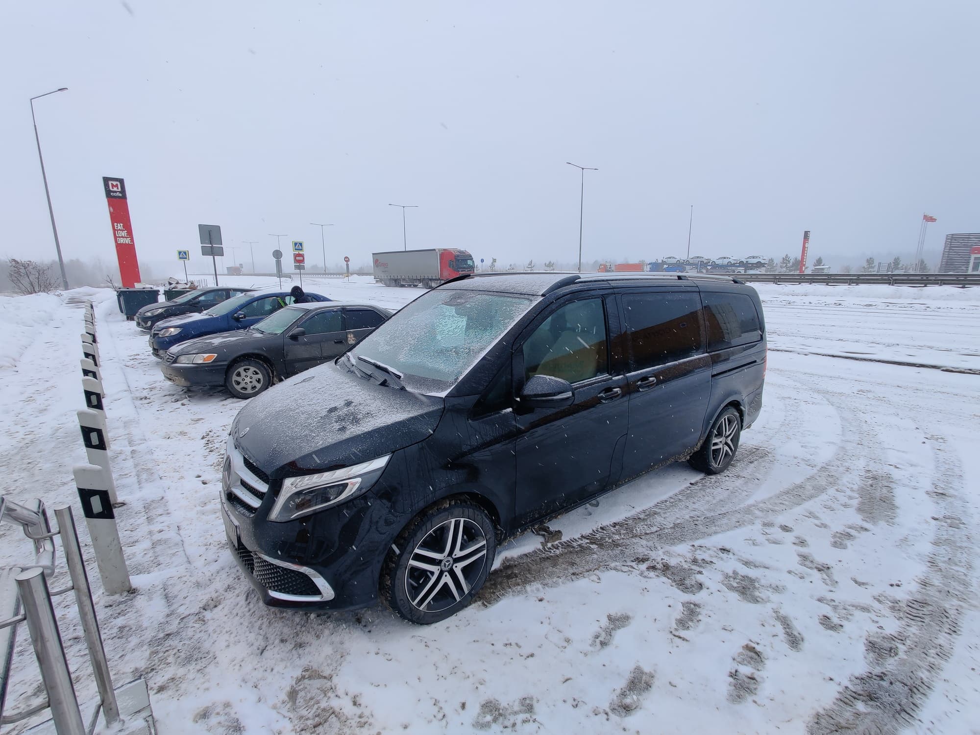 Mercedes-Benz с легкостью заезжает на заснеженные участки с рыхлым снегом. На фотографиях это плохо видно, но V250 спокойно забрался на нерасчищенный участок парковки, куда только что не смог заехать полноприводный X-Trail.