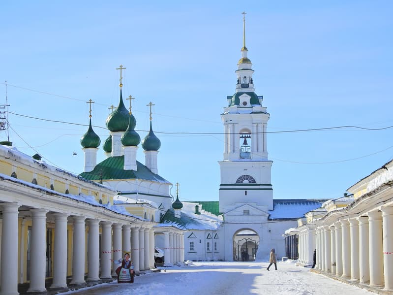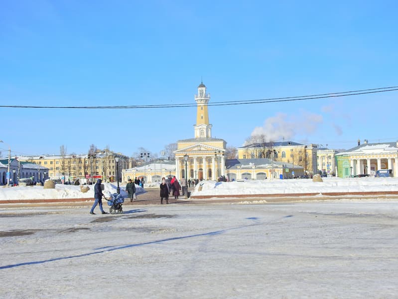 В самом центре города возвышается Пожарная каланча — памятник XIX столетия, построенный в классической манере по проекту Петра Фурсова. Архитектурные достоинства сооружения по праву оценил император Николай I во время посещения Костромы в 1834 году. После этого пожарную вышку стали называть самой красивой на территории Российской империи. Торговые ряды, расположенные неподалеку, считаются самыми показательными и наиболее хорошо сохранившимися в России. Над строительством торговых рядов трудились более ста лет и закончили только к началу XIX века. Некогда Кострома была богатым купеческим городом, а торговые ряды являлись символом экономического могущества.