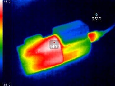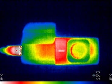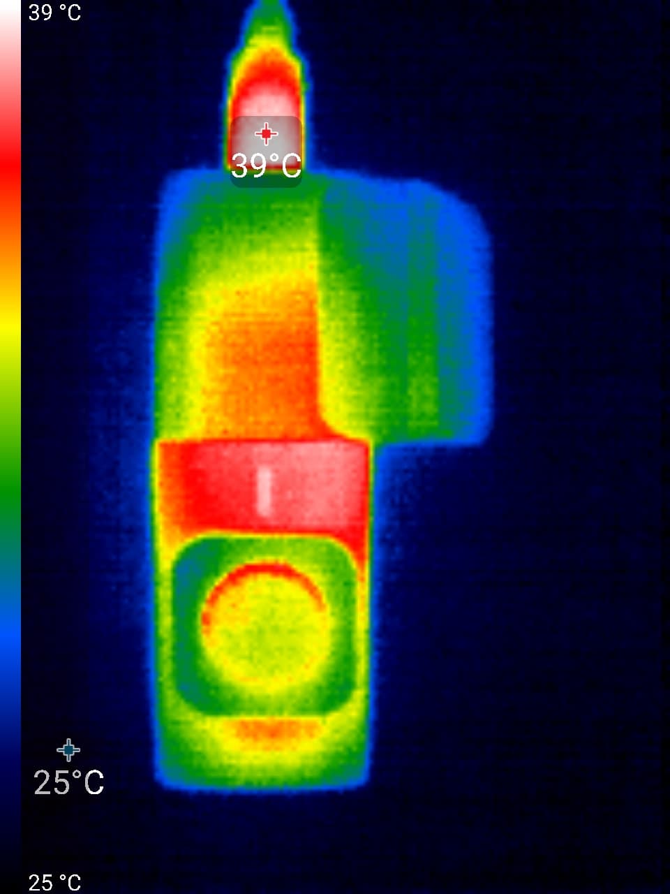 Во время длительной работы корпус аппарата, конечно же, нагревается. Ниже приводятся тепловизионные снимки регистратора, сделанные после часа беспрерывной видеозаписи. Тестирование проводилось в комнатных условиях при температуре окружающего воздуха около 25 °C.
