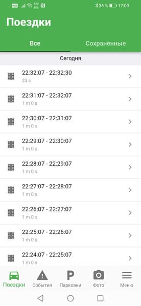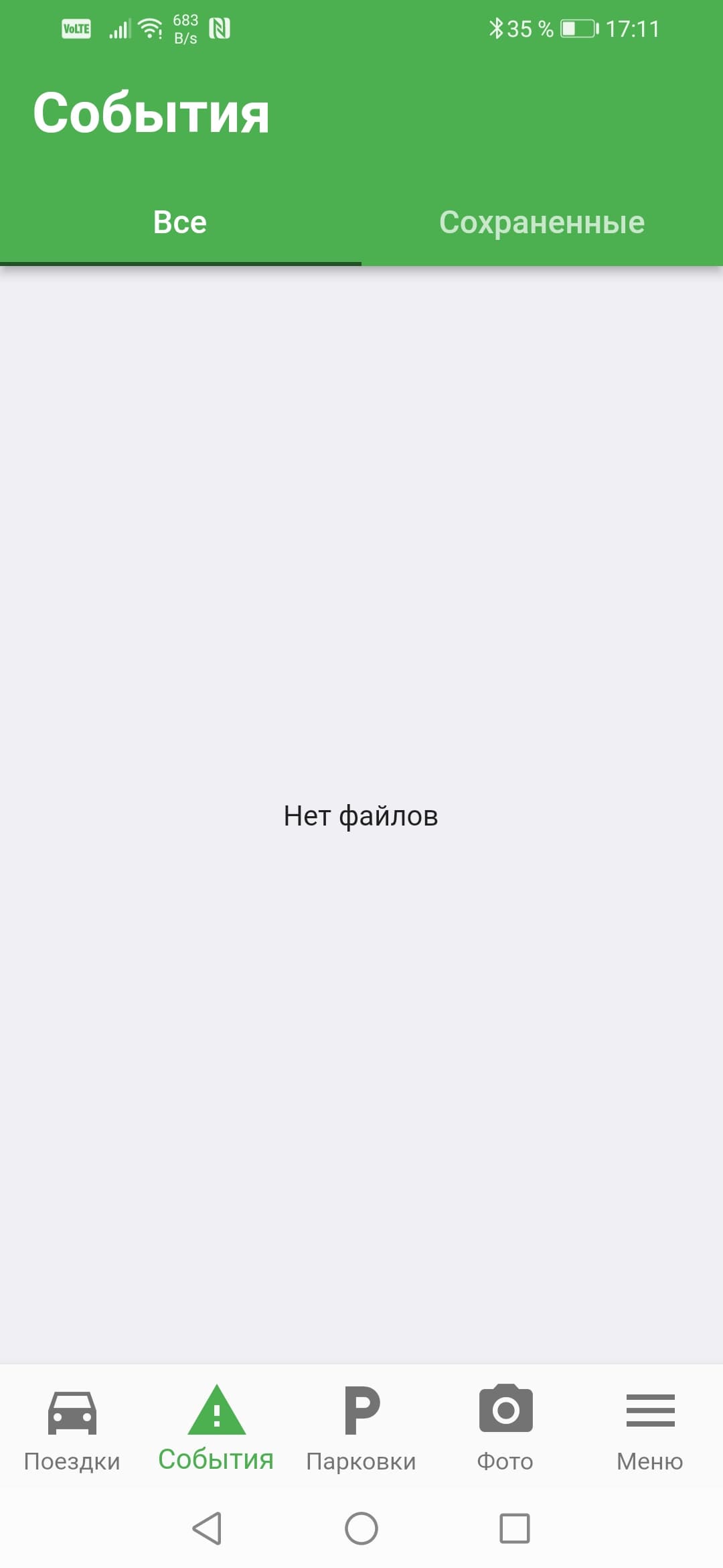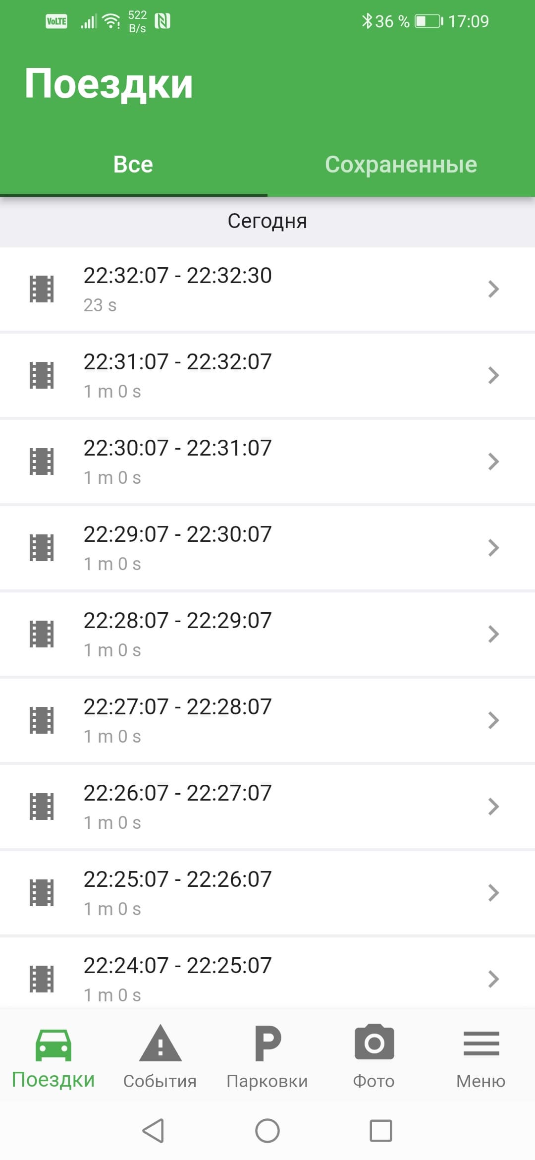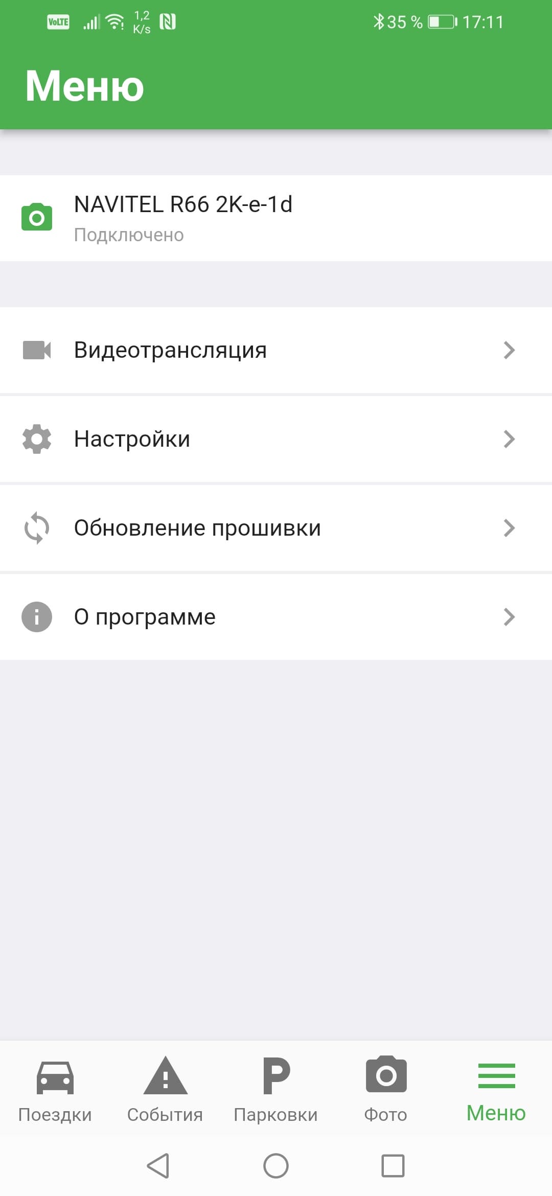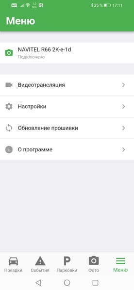 Первое, что отобразится в запущенном приложении — это список роликов, записанных на карту памяти. Прочие значки-вкладки содержат понятные описания: события, парковки и т.д. Нам это пока не нужно. То, что нужно, имеется в пункте Меню. Здесь всего четыре пункта: Видеотрансляция, Настройки, Обновление прошивки и, разумеется, О программе.