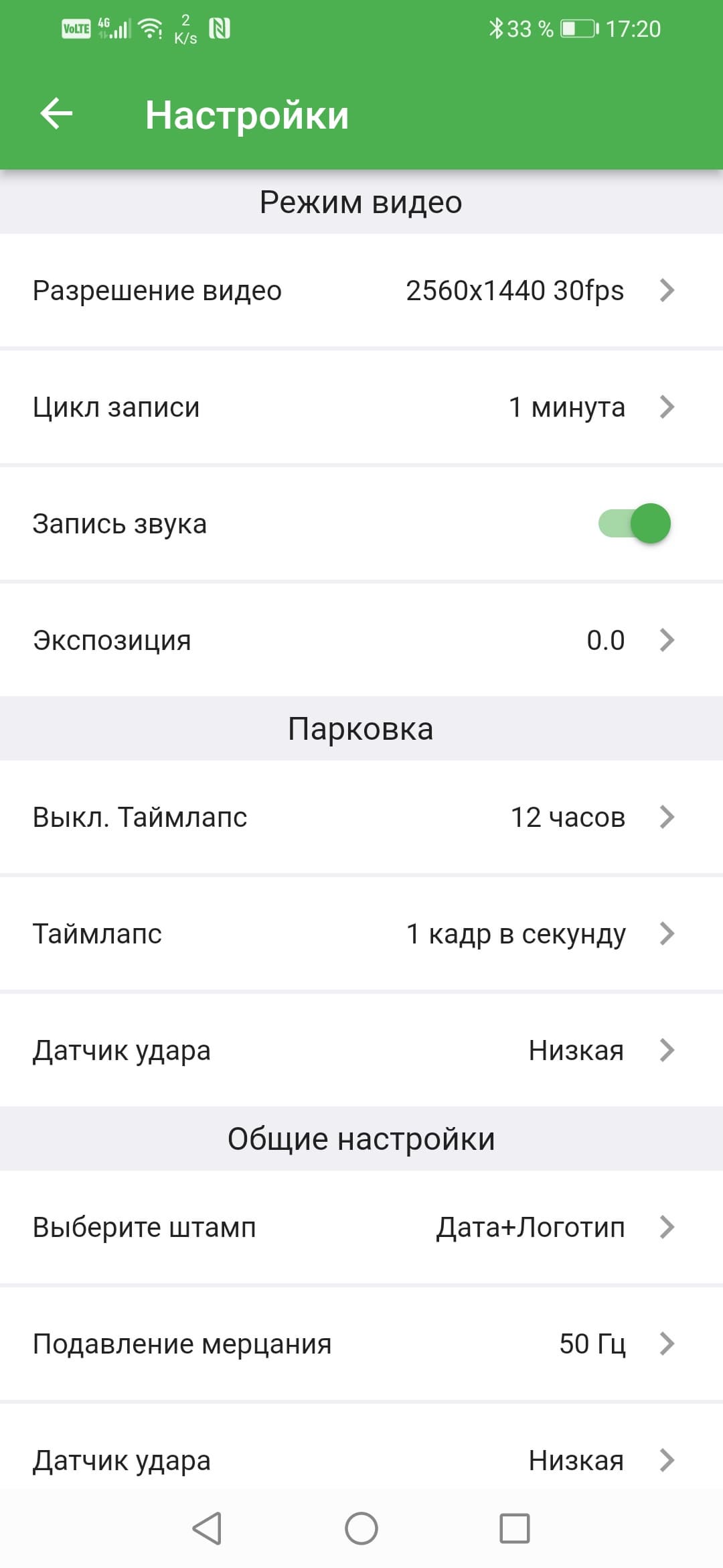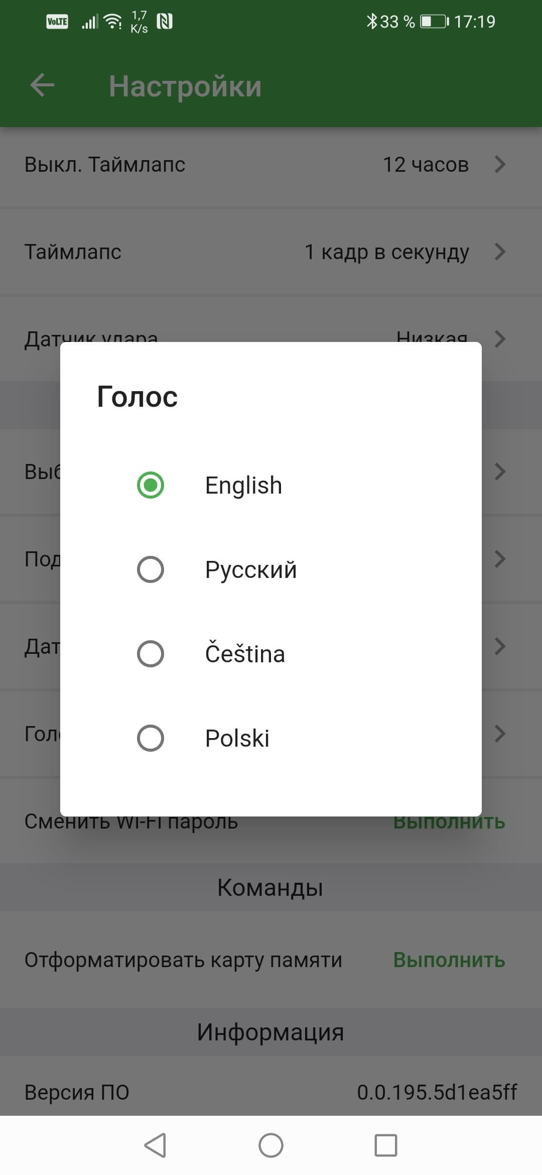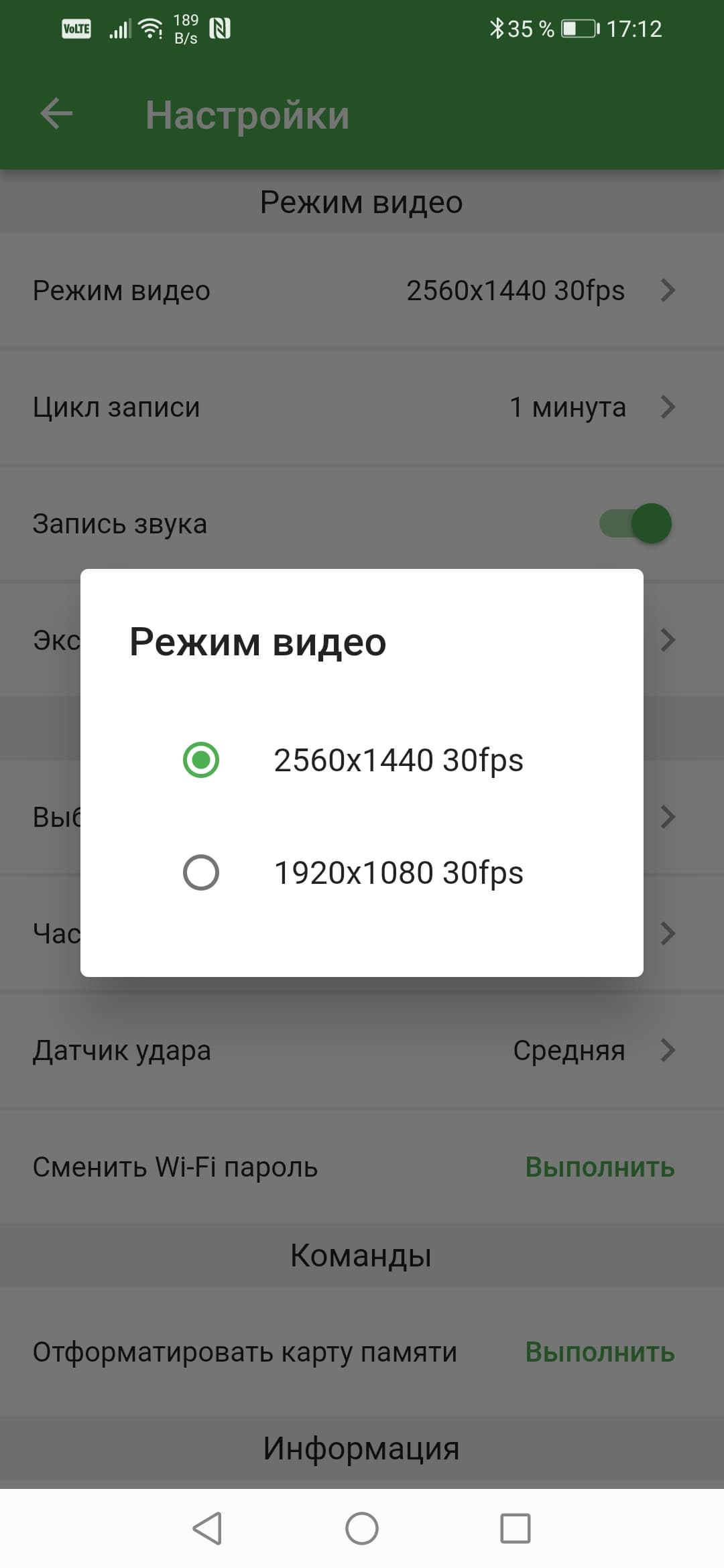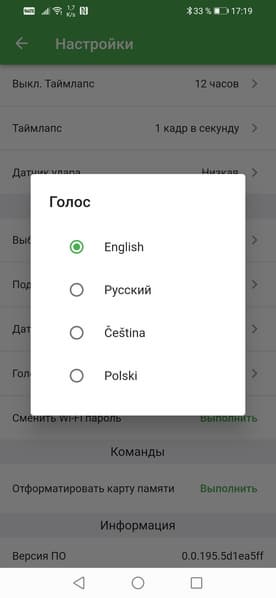 В настройках позволяется изменить разрешение видео, поменять пароль Wi-Fi-точки регистратора, отформатировать карту памяти (это обязательно), и, наконец, сменить язык, чтобы из динамика доносились оповещения на родной речи.