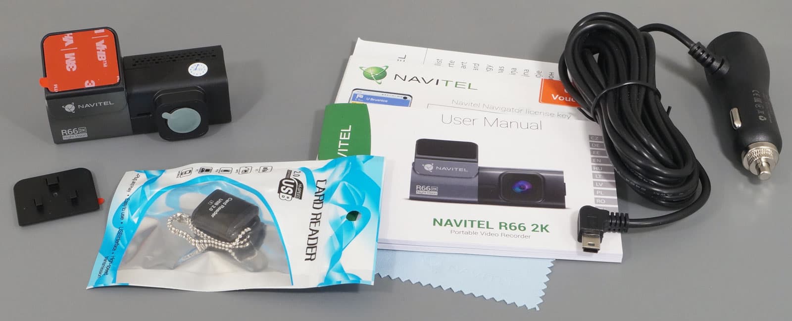 В комплекте к регистратору прилагаются дополнительная (вторая) крепежная площадка с клейкой лентой, адаптер прикуривателя с кабелем длиной 3,5 метра, миниатюрный карт-ридер в виде брелока, салфетка для протирки линзы, краткое руководство пользователя и ваучер для программы Навител Навигатор Android-версии, включающий в себя годовую подписку на карты стран Европы, Беларуси, Казахстана, России и Украины.