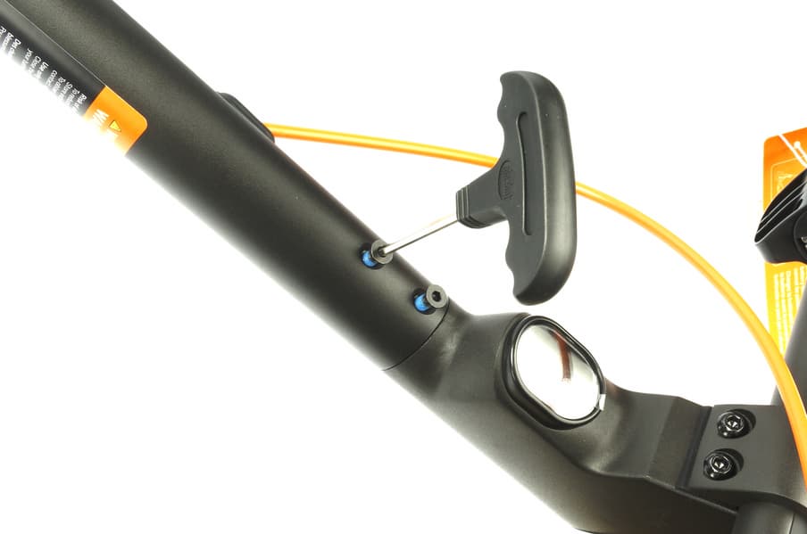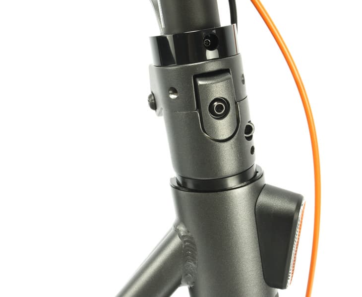 Фиксация стойки в разложенном состоянии обеспечивается с помощью откидного фиксирующего рычага. Чтобы он не раскрылся случайным образом, на его основании предусмотрена дополнительная фиксирующая защелка. Она, с одной стороны, закрепит рулевую стойку в собранном виде. А с другой — не даст стойке сложиться даже если фиксирующий рычаг находится в отрытом положении.