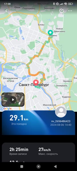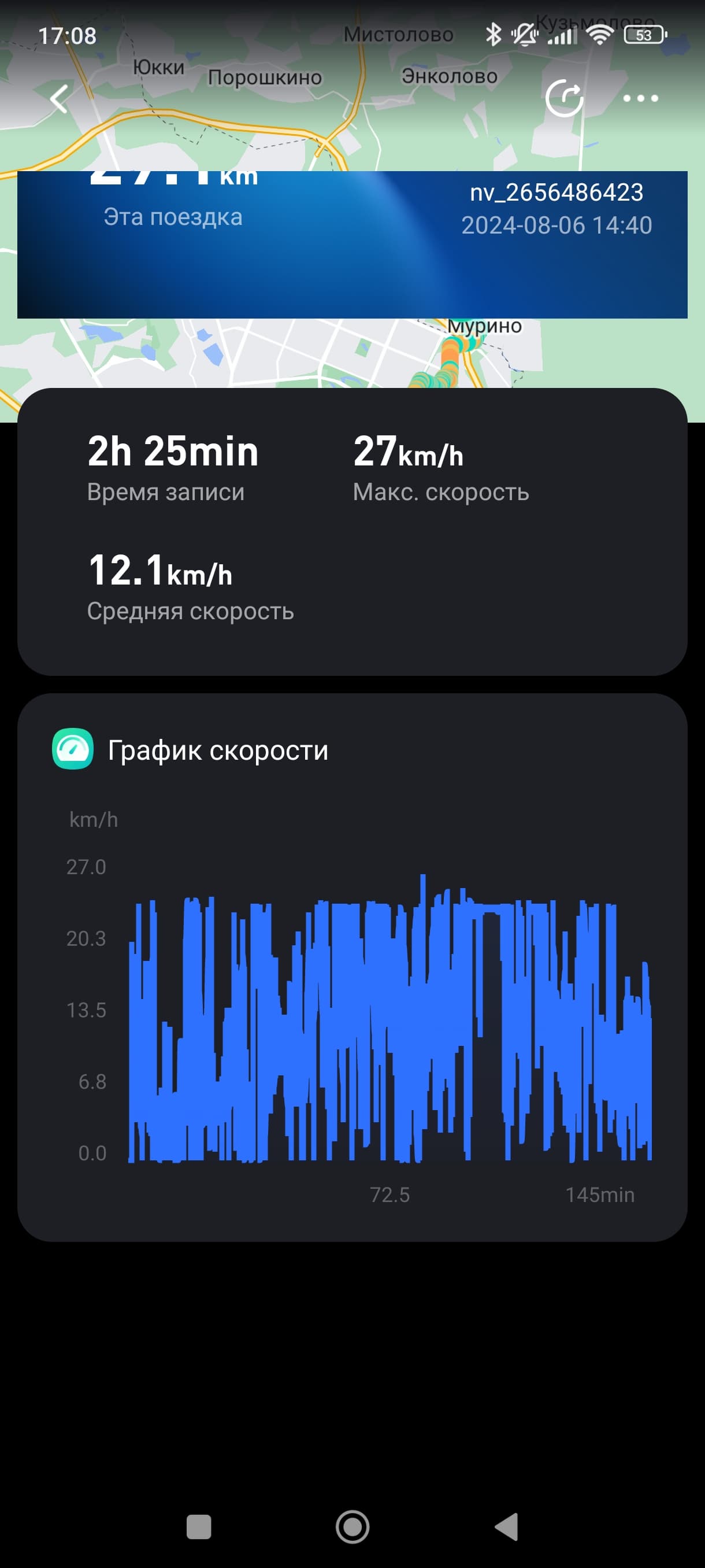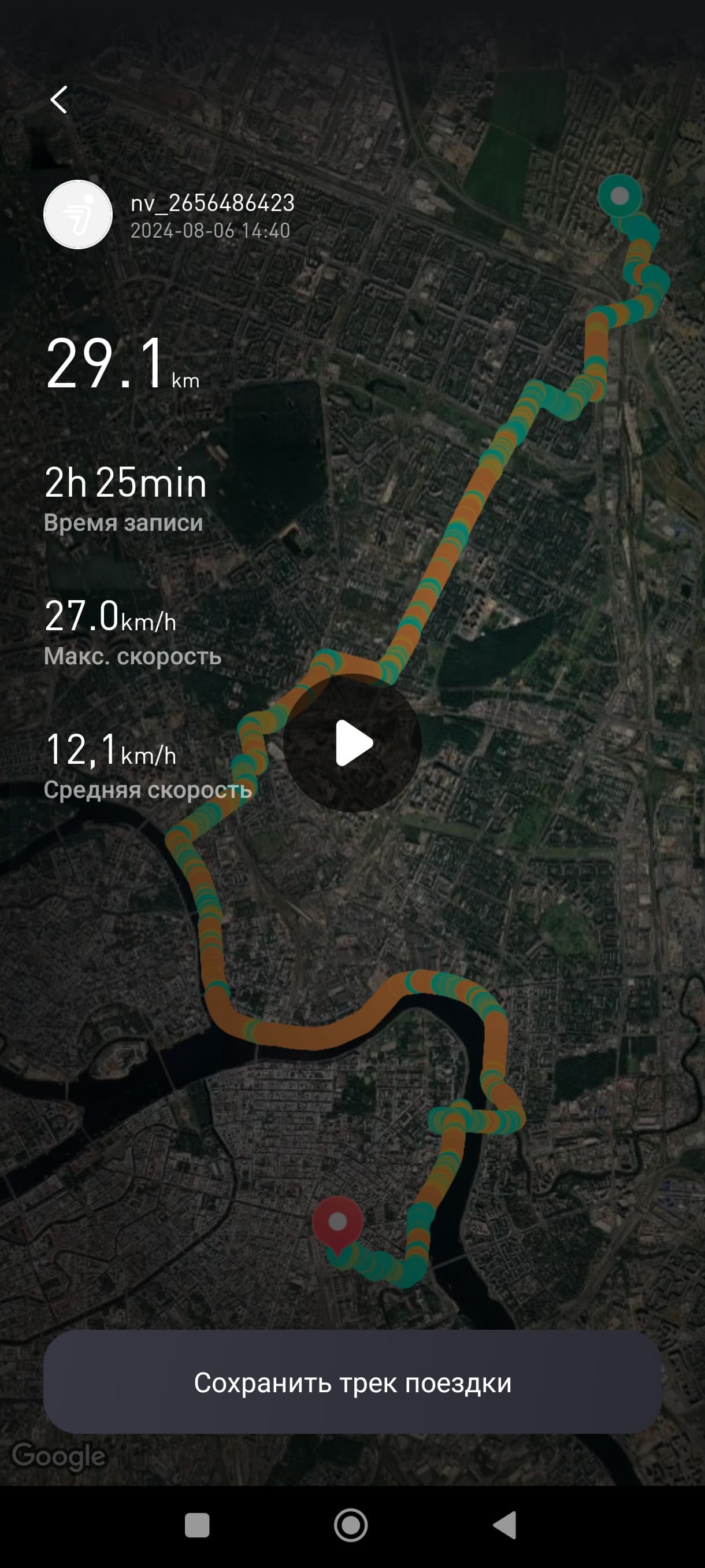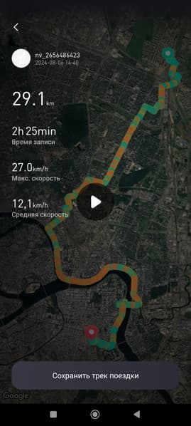 Итого — 29,1 км и почти 2,5 часа поездки. За это время самокат разрядил аккумулятор со 100% до 6%. Перемещаться на нем всё еще было можно (приложение обещало аж целых 2,4 км в запасе), однако интенсивность набора скорости при таком заряде снизилась до минимальной, а при движении в горку и вовсе приходилось помогать самокату ногами.