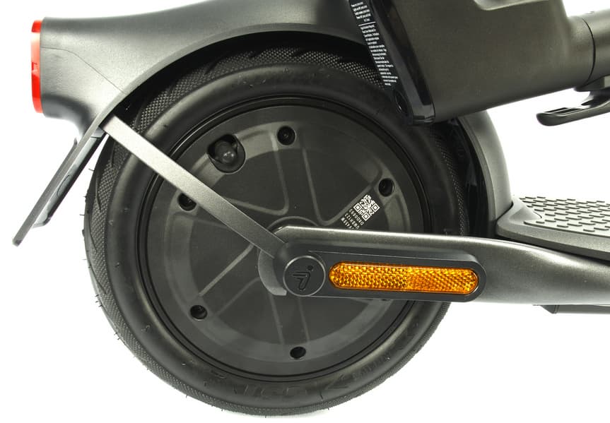 Наша модель относится к заднеприводным самокатам. Электромотор мощностью 450 Вт расположен в заднем колесе. Там же прячется и электрический тормоз E-ABS.