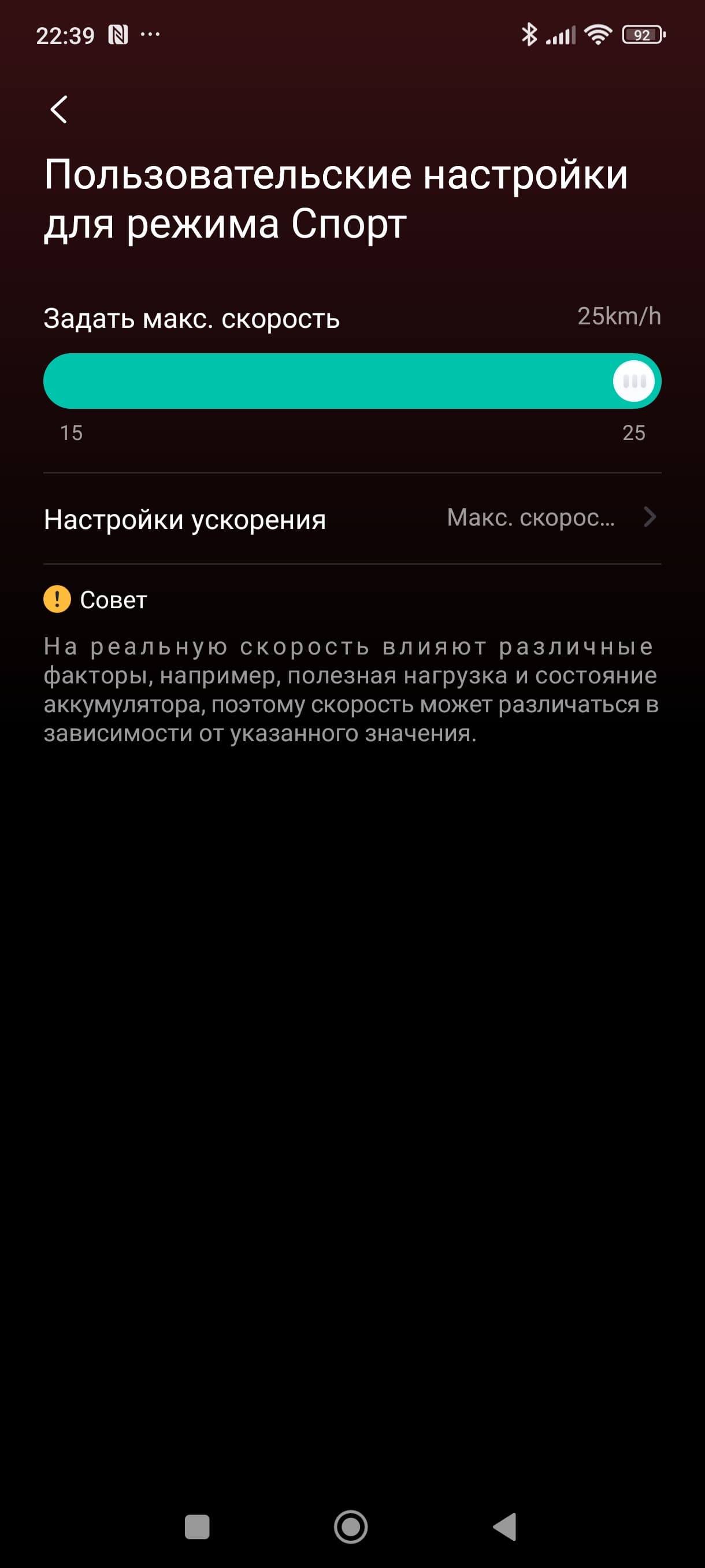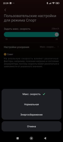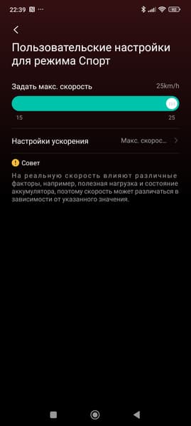 - в «пользовательских настройках» мы можем ограничить максимальную скорость для режима «Спорт», а также изменить интенсивность ускорения