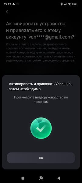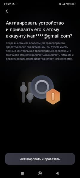 Наконец, после обновления прошивки мы сможем активировать самокат и привязать его к своему аккаунту.