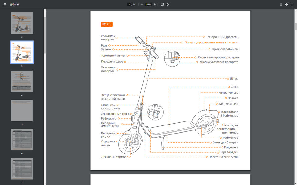 Полезной в реальной жизни информации тут, впрочем, немного. В документе мы найдем изображение самоката с перечислением всех его деталей и узлов, таблицу с техническими характеристиками, описание панели управления, а также рекомендации по регулярному техническому обслуживанию.