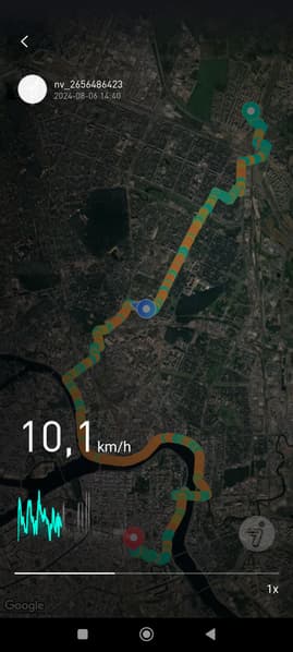В процессе поездки периодически сверялись с информацией из приложения. Выяснилось, что свою скорость самокат определяет довольно точно, без каких-либо отклонений. Все перемещения фиксируются на карте во встроенном приложении, после чего можно проанализировать маршрут, в том числе просмотреть движение точки на карте в ускоренном режиме. В зависимости от скорости, участки на карте окрашиваются в разные цвета. Так можно увидеть, где мы перемещались быстро, а где вынужденно снижали скорость.
