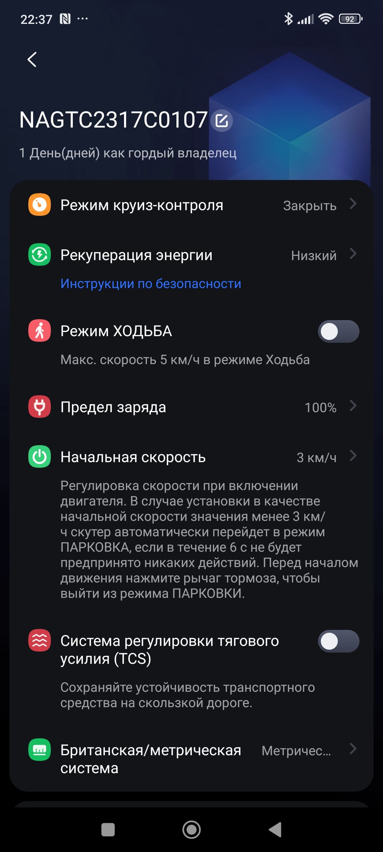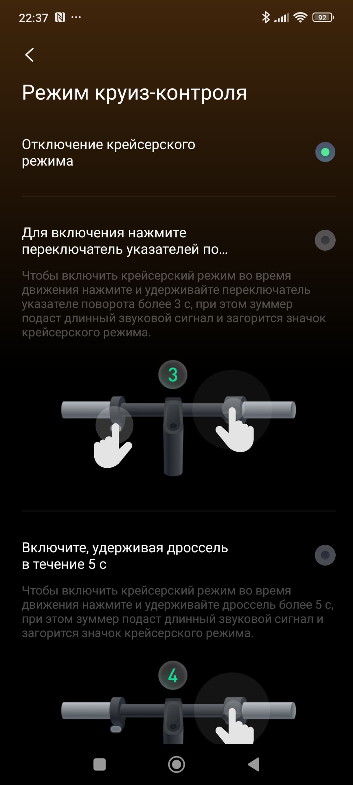 Режим круиз-контроля (поддержания актуальной скорости) нужно включить в приложении, по умолчанию он выключен. После этого круиз-контроль можно будет включить либо удерживая в течение 3 секунд переключатель указателя поворота, либо удерживая дроссель в течение 5 секунд.