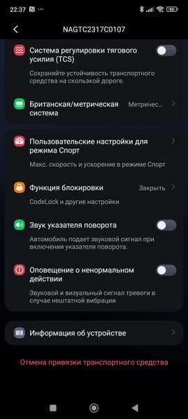 Раздел «о транспортном средстве» у нас не заработал. Предполагаем, что он должен выдавать какую-то справочную информацию. Кнопка «задать пароль» позволит установить пароль на самокат (это можно сделать на самом самокате, с помощью нажатия на кнопки включения сигналов поворота).