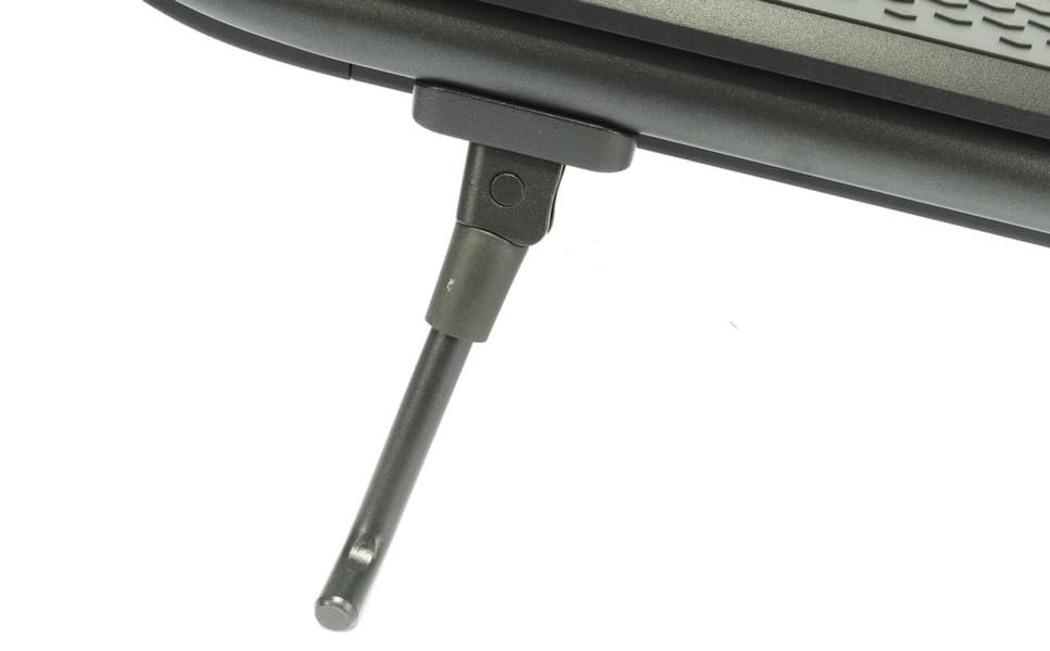 Единственное, что нас интересует в нижней части самоката — это откидная металлическая подножка, которая уверенно удерживает аппарат в вертикальном положении. Откидывается и складывается подножка левой ногой.