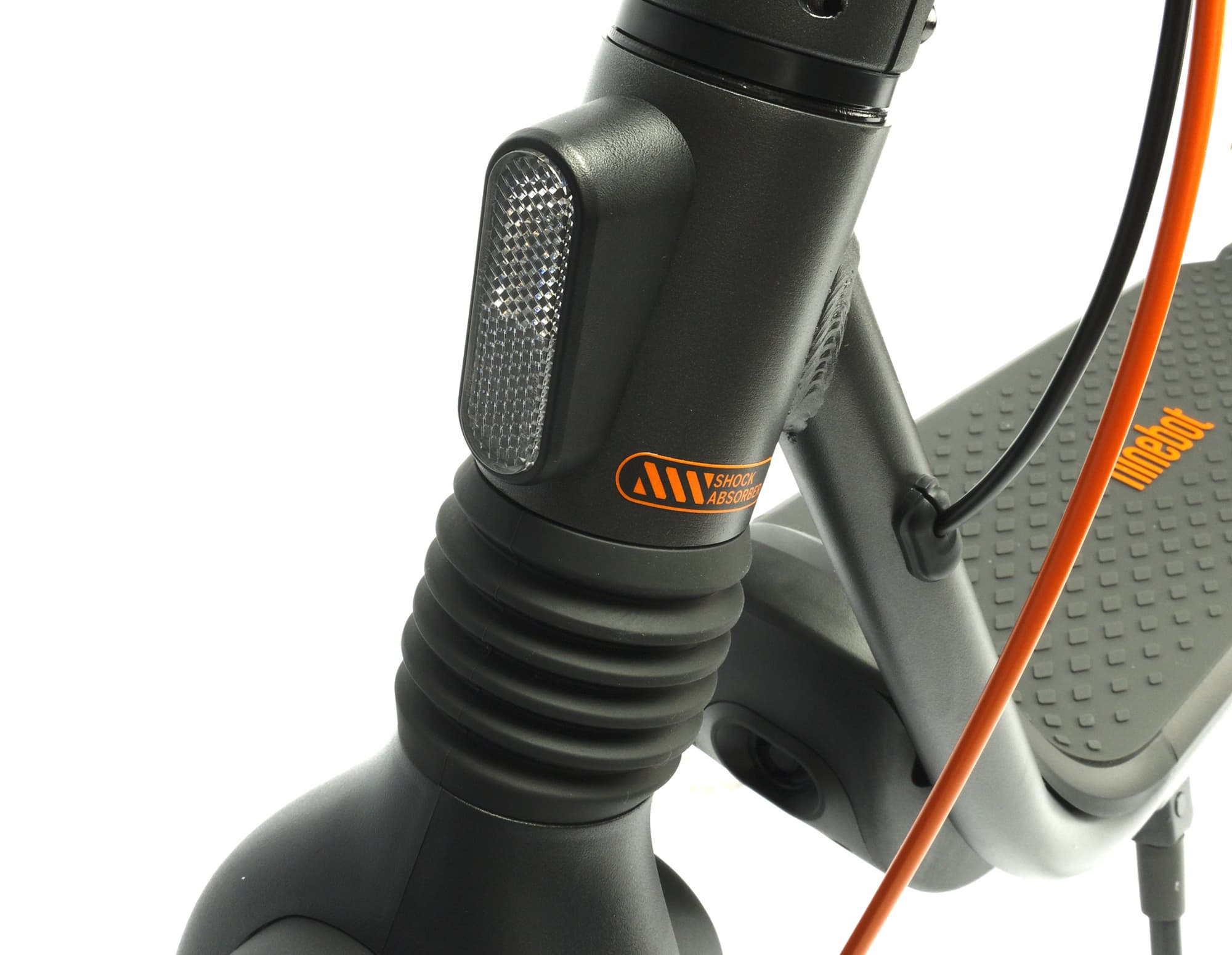 Рядом с колесами мы также найдем оранжевые светоотражающие рефлекторы. Еще один рефлектор находится на передней стойке, в нижней ее части.