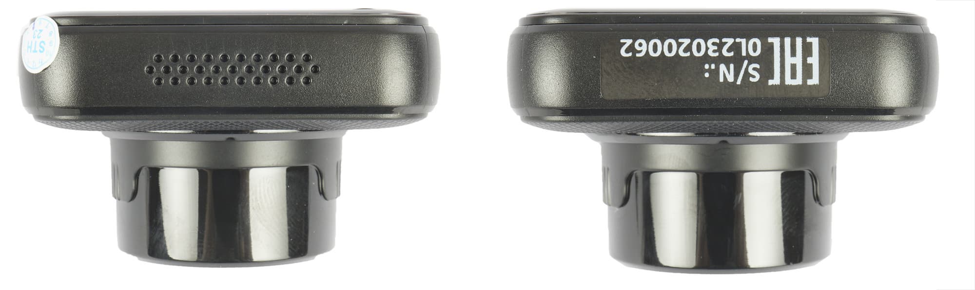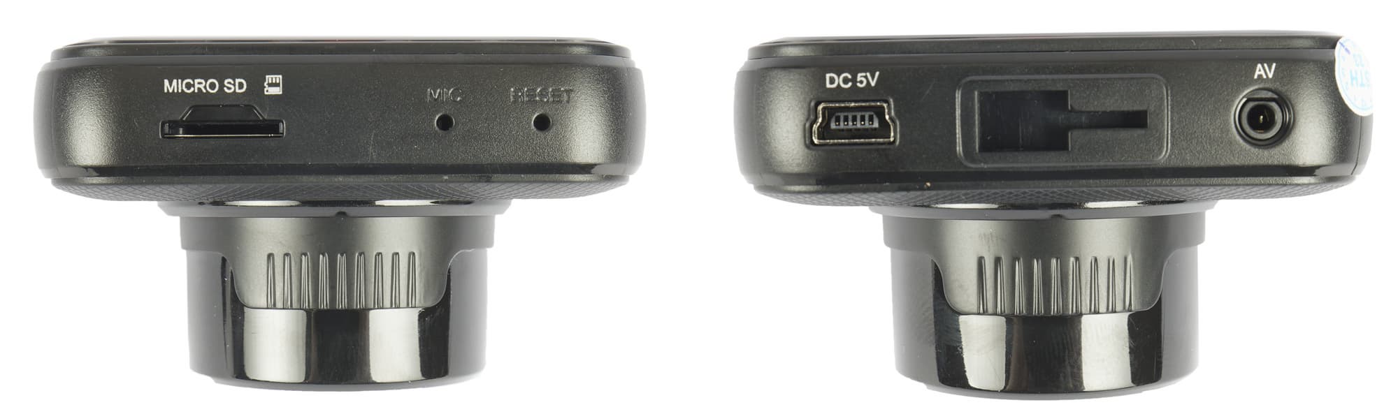 На нижней стороне располагается слот для карты microSD. Рядом с ним можно видеть отверстие микрофона и углубление, в котором спрятана кнопка сброса. На верхней грани — Т-образное отверстие быстросъемного крепления. Слева от него разъем mini-USB, обеспечивающий питание регистратора, а справа — отверстие для подключения камеры заднего вида (она не входит в комплект и приобретается отдельно).