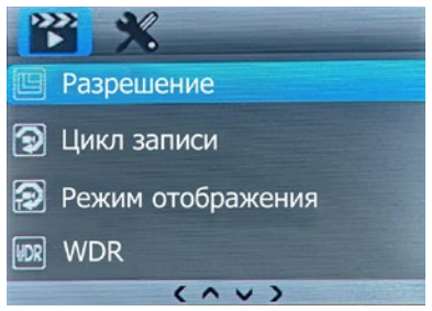 Короткое нажатие открывает меню конфигурации прибора, которое состоит из трех разделов: общих настроек, установок видео и фото.