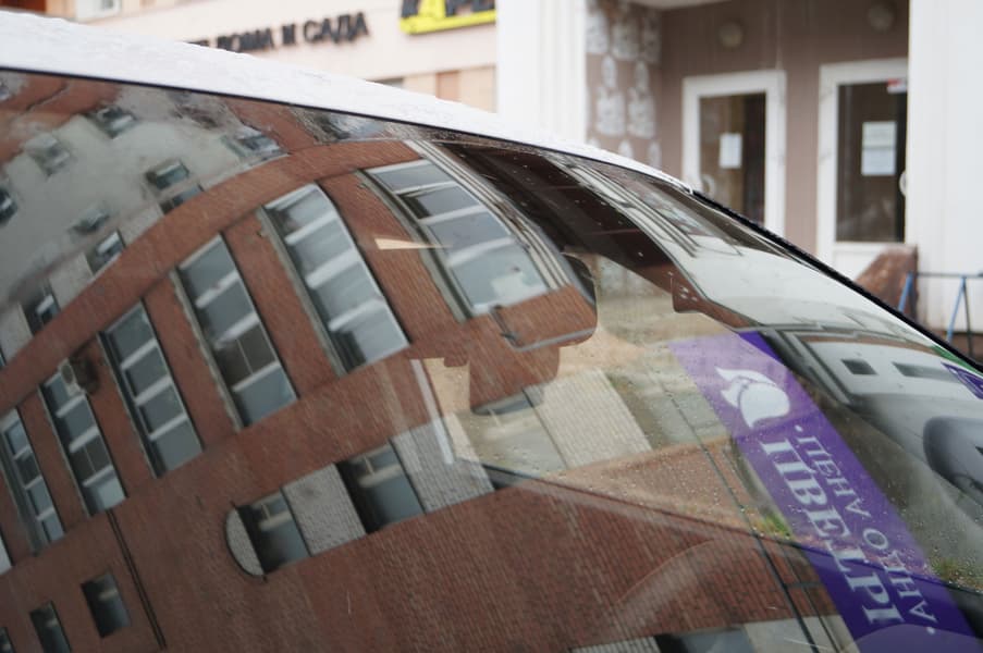 Регистратор, установленный внутри автомобиля, практически незаметен снаружи. Матовый черный корпус регистратора не дает бликов, а белый текст, напечатанный по периметру объектива, слишком мелок, чтобы «выдать» прибор.