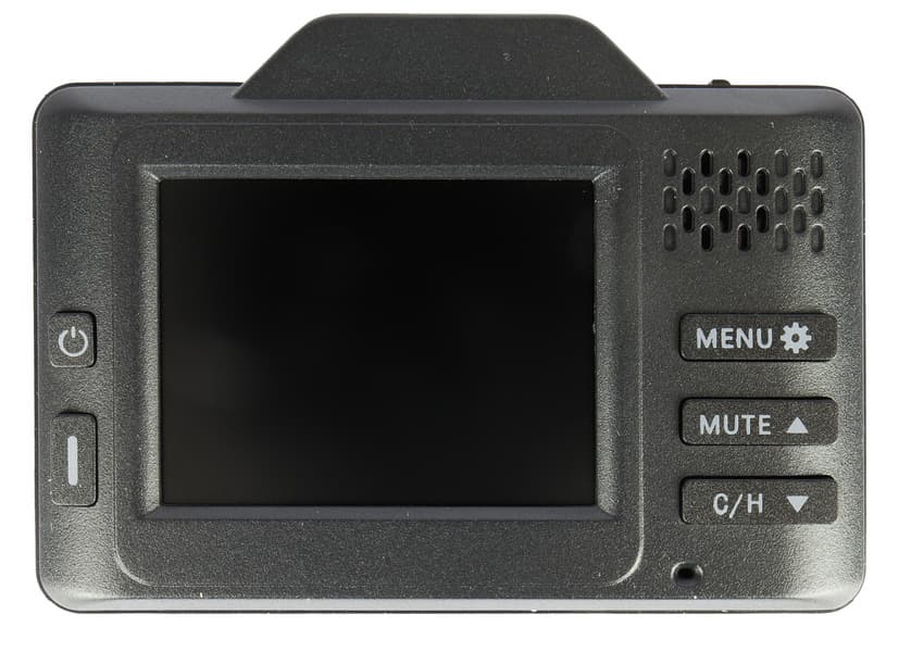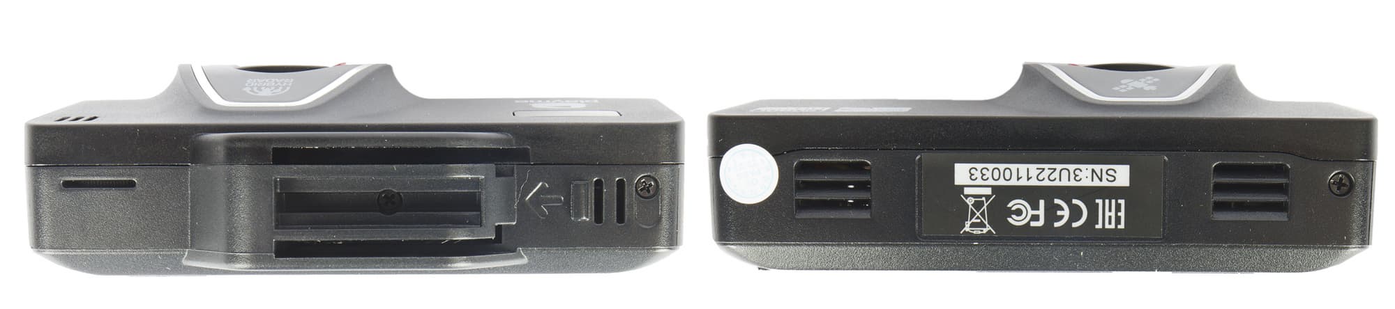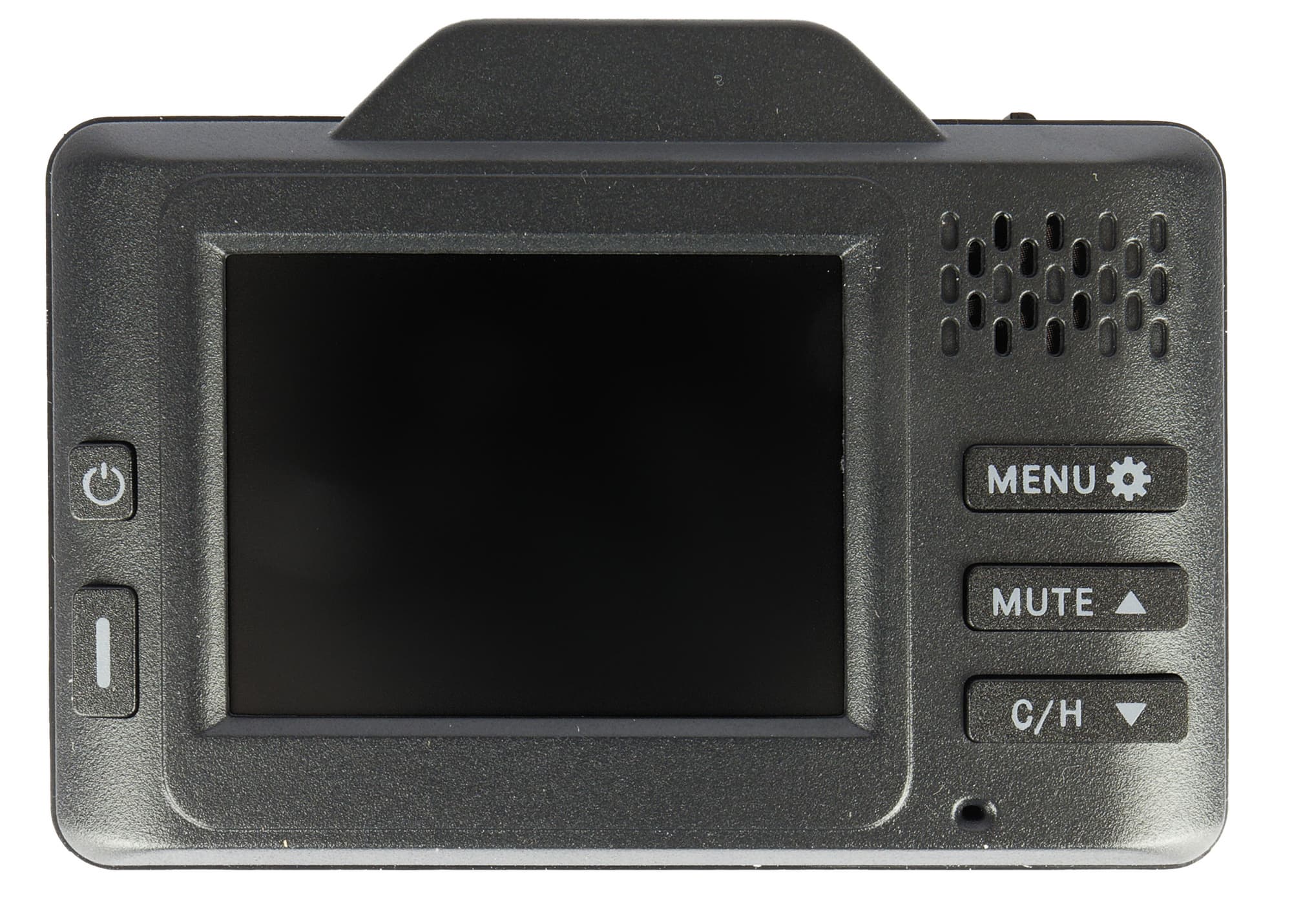 Помимо объектива на передней панели есть также приемное окно радар-детектора. Под ним — логотип производителя.