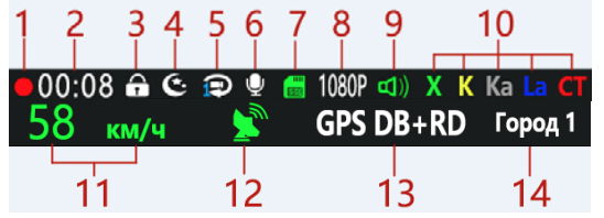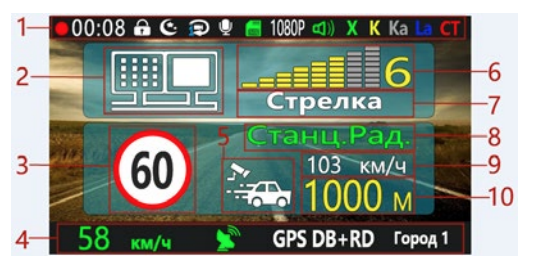 - Индикацию текущей скорости, статуса GPS, режима оповещения и режима чувствительности