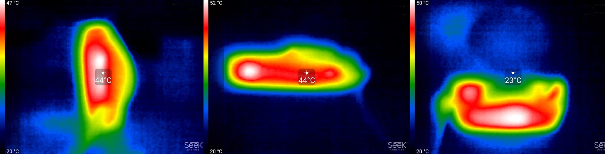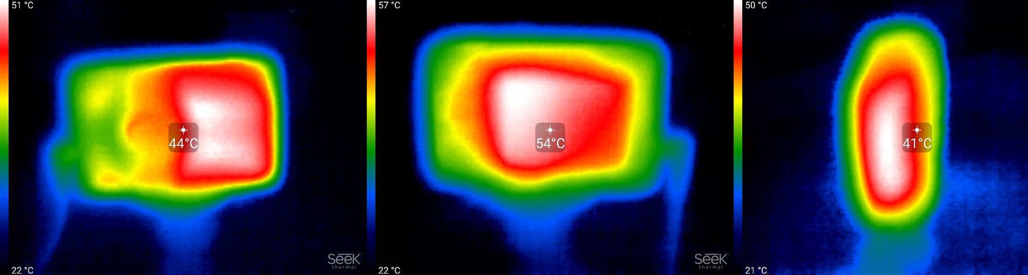 Во время длительной работы корпус аппарата естественным образом нагревается, как и любой современный прибор. Мы приводим тепловизионные снимки, сделанные после часа непрерывной видеозаписи с работающим дисплеем. Питание подавалось стационарное, тестирование проводилось в комнатных условиях при температуре окружающего воздуха около 20 °C