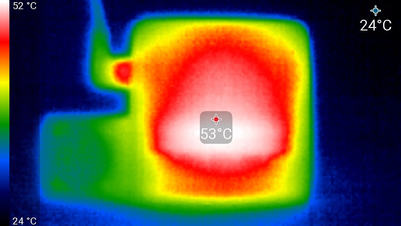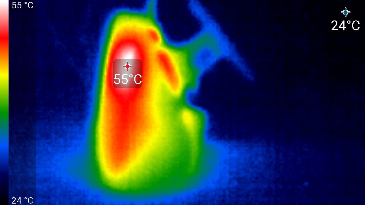 Видно, что корпус нагревается сильнее всего в районе слота карты памяти. Здесь температура достигает 55 °C. Это не есть хорошо, память не любит нагрева. Также сильный нагрев наблюдается в нижней части экрана (53 °C), где, по всей видимости, расположен процессор.