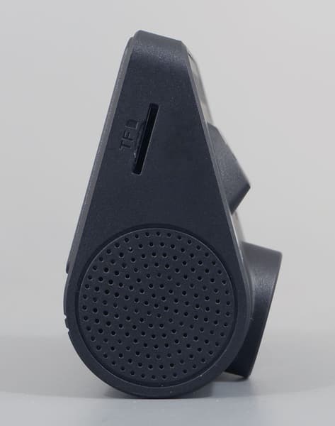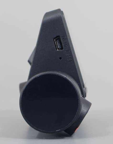 Пластиковый корпус регистратора имеет форму, которая целиком обусловлена назначением устройства. Если бы не нужда в экране, то аппарат выглядел бы как цилиндр с двумя объективами. Здесь же дисплей выступает над цилиндрическим блоком с оптикой. Расположение элементов выглядит продуманным, к качеству отливки деталей и сборки нет никаких претензий (это, к счастью, давно научились делать как следует). Пять механических кнопок, расположенных в ряд под дисплеем, прекрасно нащупываются в темноте. Кнопки не дребезжат, имеют мягкий и четкий ход.