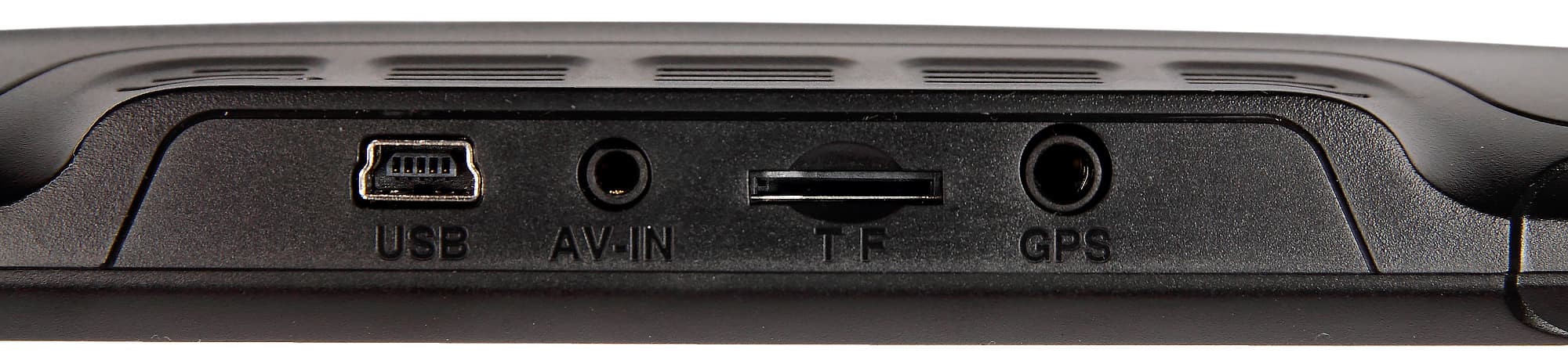 На верхней грани находятся разъемы Mini-USB (для обновления базы карт, он же питание), разъем AV-In для подключения второй камеры, microSD для карточки и еще один разъем штырькового типа для подключения внешнего GPS-модуля. Все разъемы подписаны, так что ошибка при подключении практически исключена.