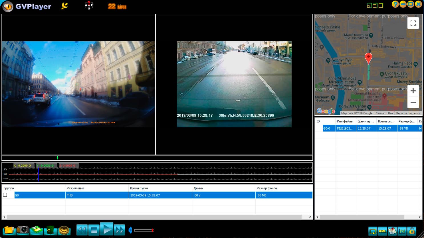 Предлагаемый для использования с прибором видеоплеер GVPlayer наконец-то можно скачать с сайта Playme. Но лучше он от этого не стал: запускается с англоязычным интерфейсом по умолчанию, из общеупотребимых карт знает только Google (да и ту выводит почему-то на сером фоне и с надписью «For development purposes only»). Правда, при сохранении «родной» структуры каталогов, умеет при выборе файла с головной камеры автоматически «подхватывать» нужный файл с тыловой. Но это, пожалуй, единственное его достоинство.
