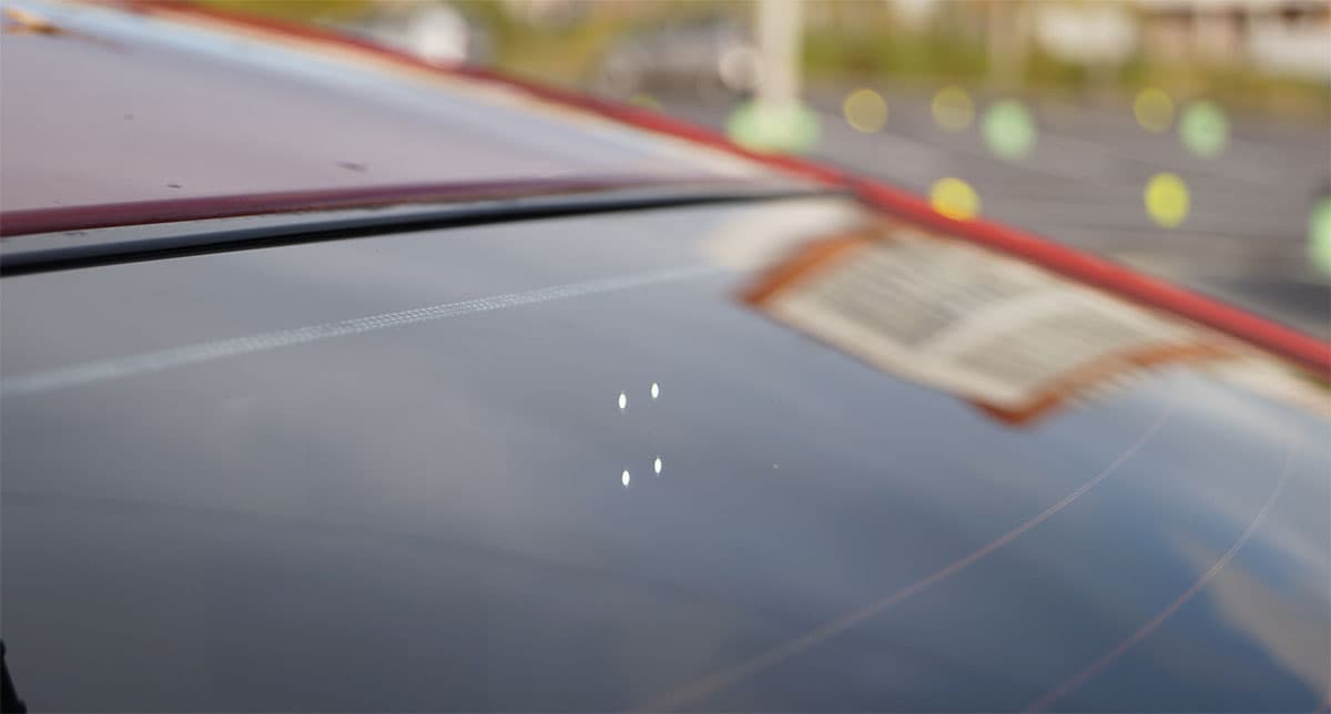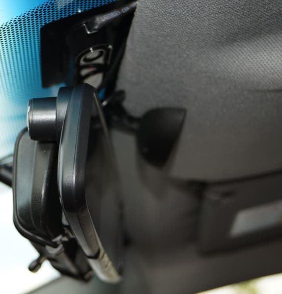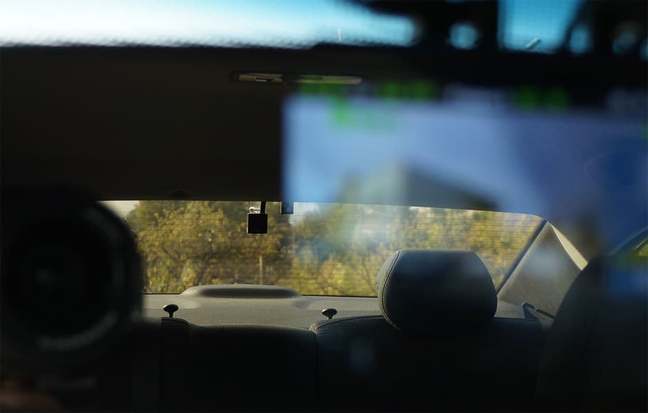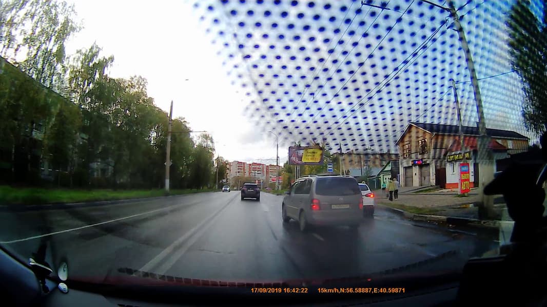 Такое высокое расположение может затруднить эксплуатацию регистратора в некоторых моделях автомобилей. Дело в том, что на современные лобовые стекла производитель наносит фритты — специальные черные точки. Эти объекты печатаются особой керамической краской, которая потом запекается в термокамере. Фритты обычно располагаются по периметру стекла и в области зеркала заднего вида. Они выполняют несколько функций. В частности, защищают герметик от воздействия ультрафиолета, а водителя — от слепящего солнца. Но в нашем случае эта защита может сыграть плохую роль: если штатное зеркало расположено высоко, а область фриттов — низко, то в кадр рискует попасть скопище черных точек. Именно это и произошло в нашем случае.