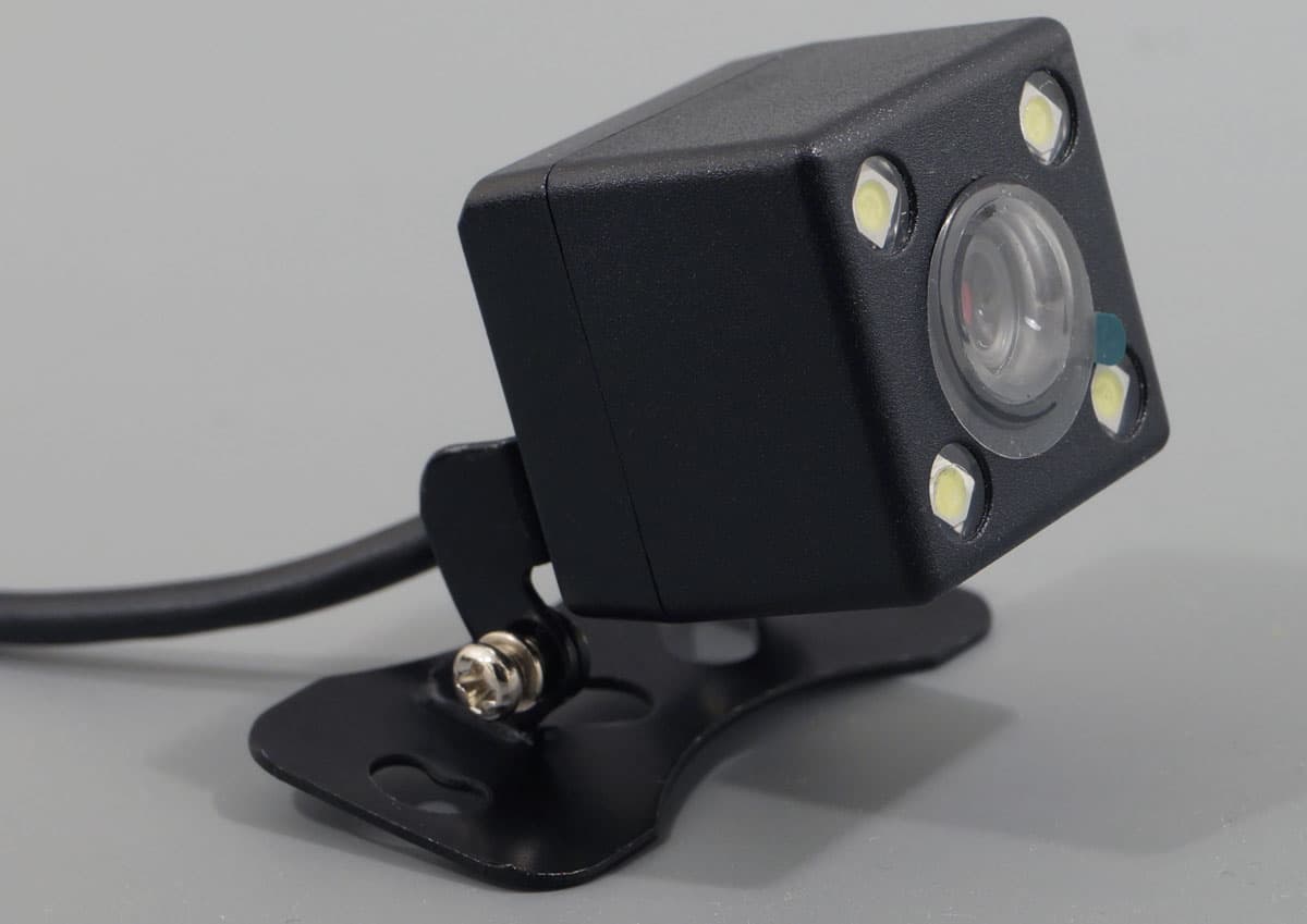 Коснемся других агрегатов, входящих в сборку. Вторая камера — небольшой кубик со степенью защиты, позволяющей эксплуатацию под дождем. Устанавливать эту камеру можно как снаружи, на задний бампер либо над задним стеклом, так и внутри салона автомобиля. Длина кабеля, по которому в камеру поступает питание от регистратора и по которому на регистратор передается видео, достигает 6,5 м. Камера имеет четыре белых светодиода, они играют роль дополнительного фонаря заднего хода.