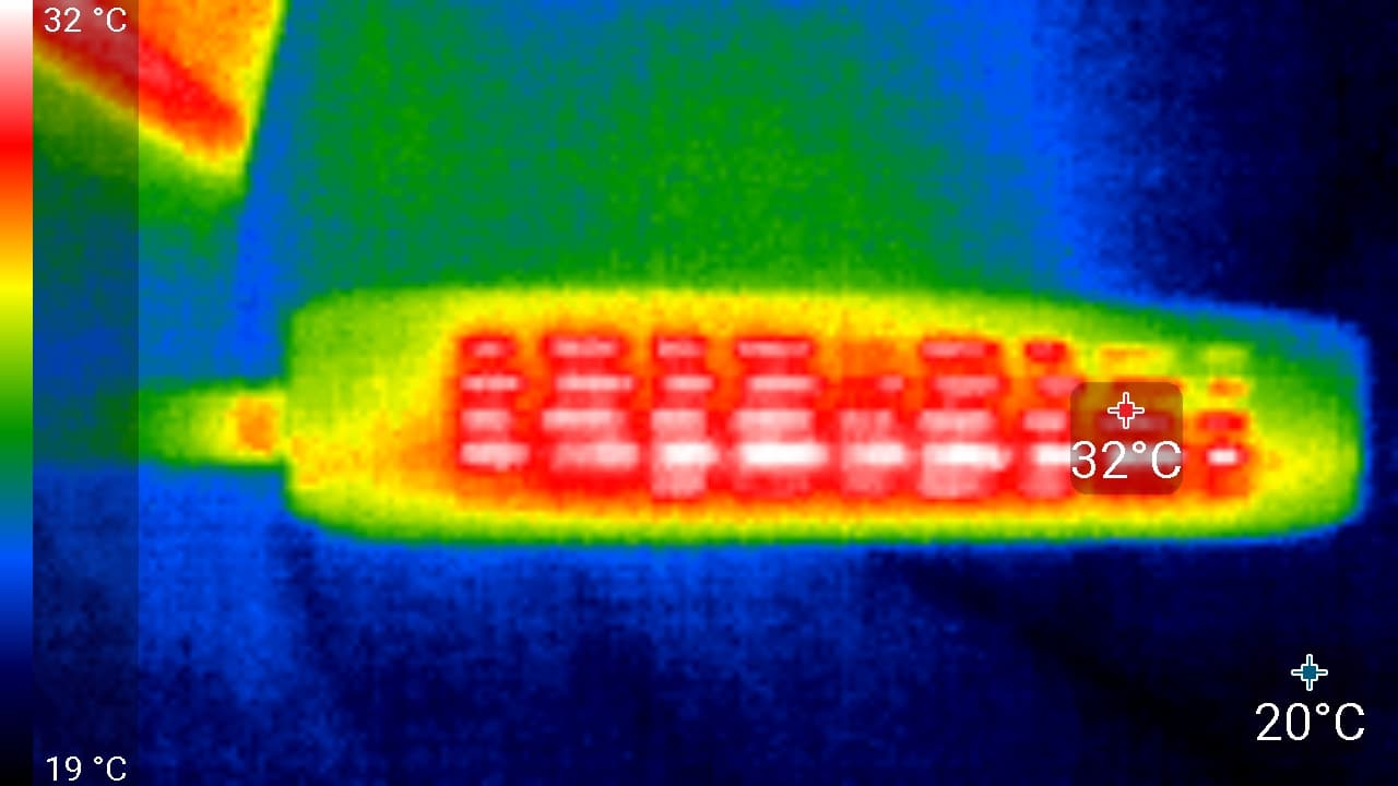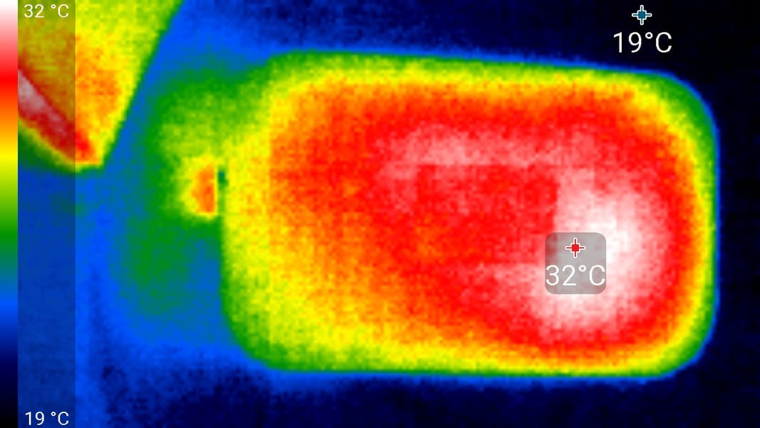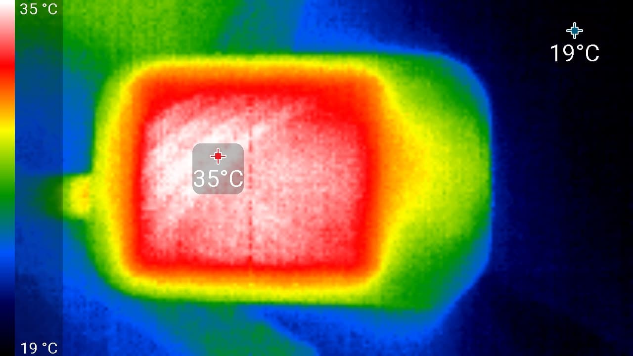 На снимках видно, что максимальная температура корпуса устройства составила 35 °C на участке, под которым, по всей видимости, расположен процессор. Такая температура совершенно не опасна для электронных устройств.