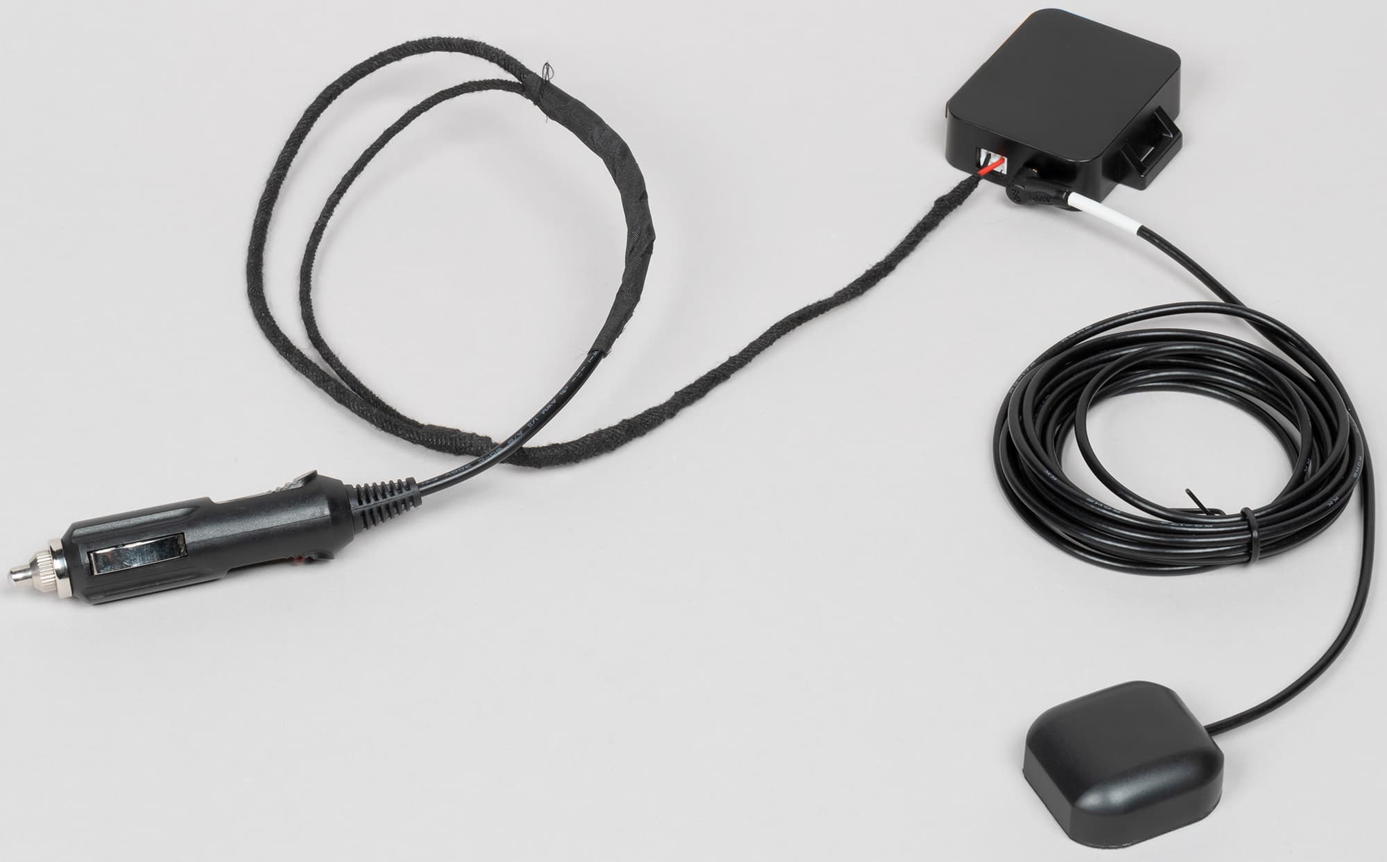 Также в комплекте имеется внешняя GPS-антенна, которая состоит из собственно антенного блока с кабелем длиной 3 м и приемо-передающего устройства для GPS-антенны, с помощью которого осуществляется беспроводное соединение с приставкой. Питание этого передатчика берется из бортовой системы автомобиля, для подключения к которой прилагаются кабели с нужными клеммами.