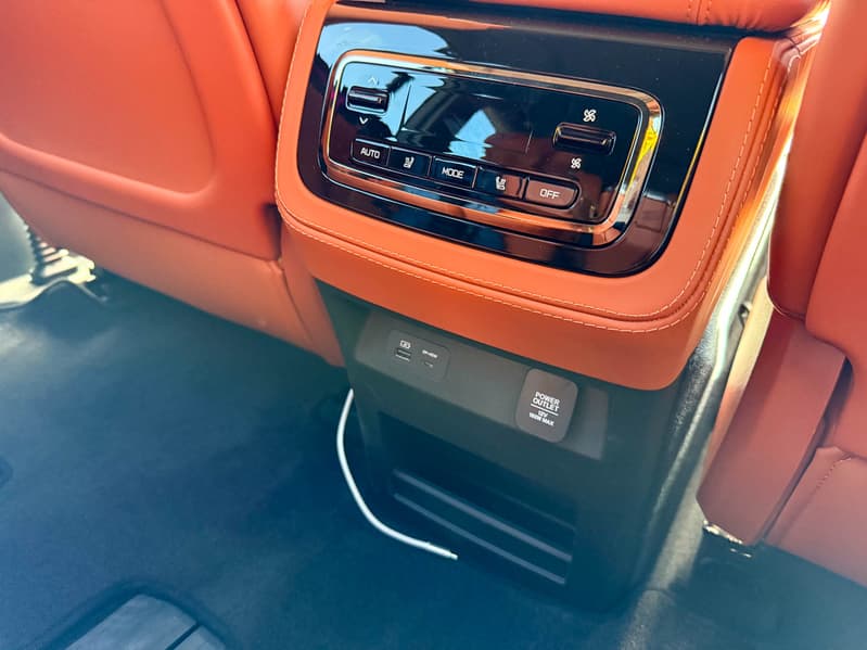 Выше упоминался регистратор, который сохраняет записи на флешке. Она должна быть вставлена в один из многочисленных USB-портов. Спереди в нише есть USB-A и USB-B. Под подтокотником можно вытащить лоток, и тогда откроется еще один USB-A. Плюс есть пара разъёмов в консоли во втором ряду (и, кстати, 12-вольтовый «прикуриватель» там же), по USB-A в подлокотнике каждого кресла. Для дальних автопробегов имеется розетка на 220 вольт в багажнике. Она может выдать до 2200 Ватт — должно хватить даже на чайник.