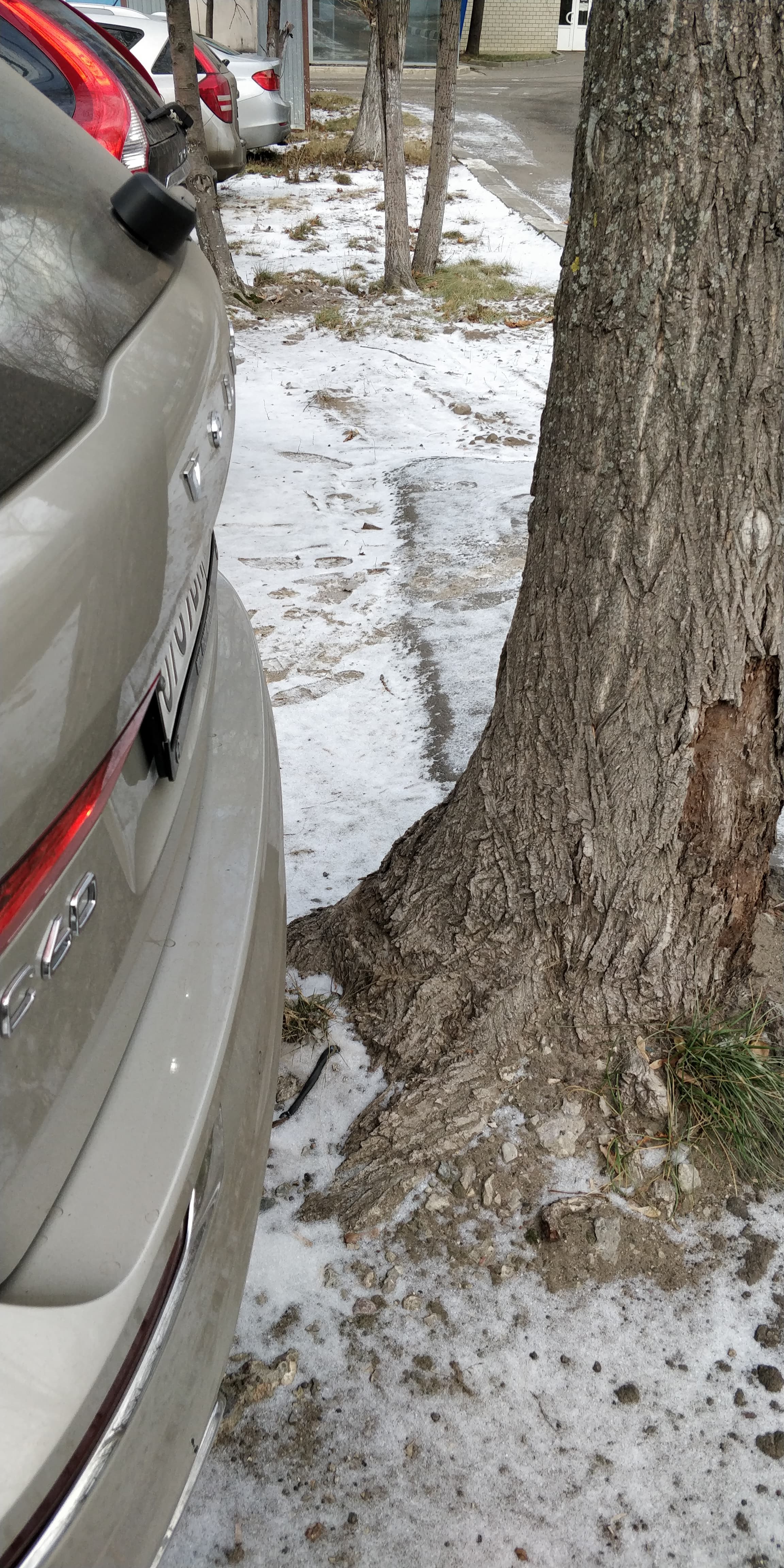 В результате, когда я осознал, что автомобиль сам останавливаться не будет, а парктроник уже находился в красной зоне и отчаянно подавал настойчивые сигналы, я резко нажал на тормоз, благо нога была над педалью. Машина качнулась и… «тюкнула» столбик, отделяющий тротуар от проезжей части. Итогом неудавшегося теста стала небольшая «коцка» на бампере, а мне — наука, что руководство по эксплуатации надо читать внимательнее. Тем не менее, стоит отметить, что настройки парктроника таковы, что останавливаться надо уже в желтой зоне, потому как красная зона у XC60 сигнализирует уже о непосредственном сближении с препятствием и фактическом его касании через пару сантиметров. При этом сложилось впечатление, что задняя камера передает сигнал на планшет-монитор с полусекундной задержкой. Для примера, на фотографии дерево, находящееся в десяти сантиметрах от бампера — в желтой зоне, а красная начнется, когда до дерева останется буквально 3-4 сантиметра. Панорамная камера в этом случае вряд ли будет серьезным подспорьем.