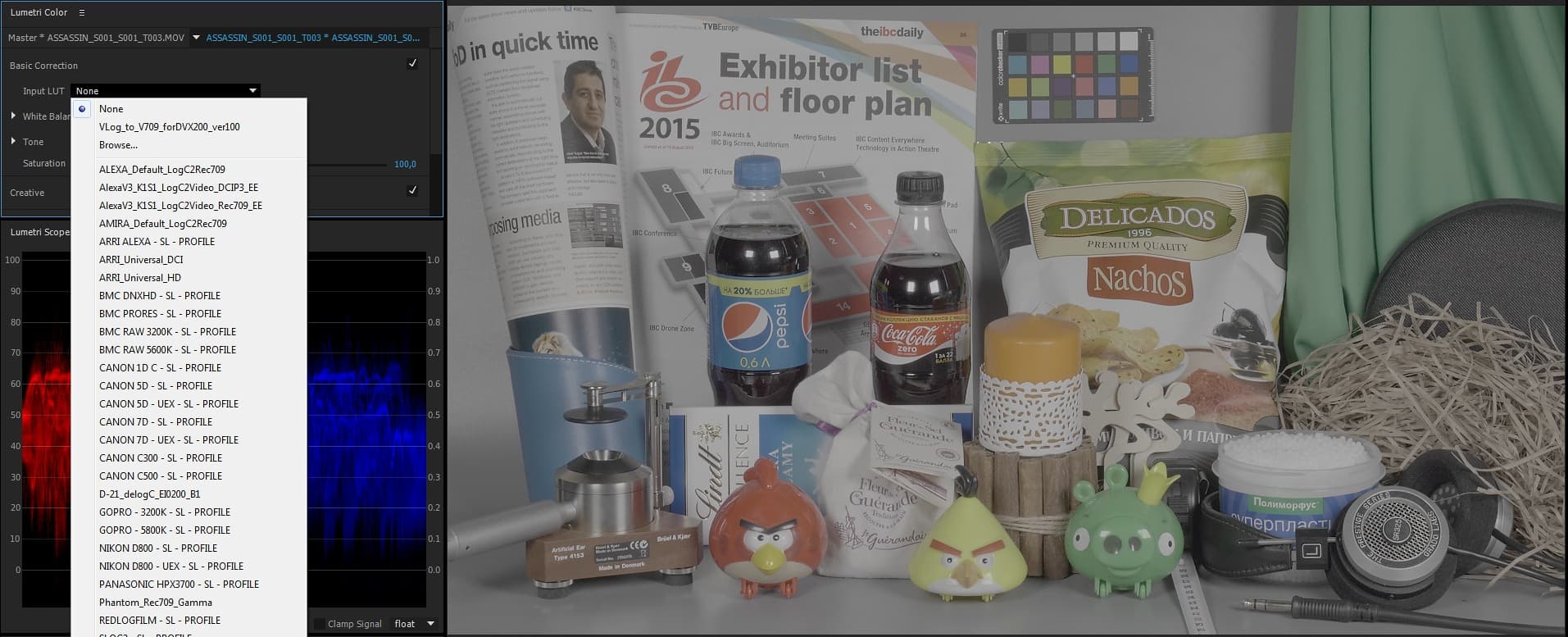 Даже если под рукой нет подходящего LUT-пресета, в Premiere Pro и других программах вполне можно взять Arri Alexa LogC. У загружаемого из файла пресета Panasonic DVX200 v1.00 помимо преобразования гаммы производится цветокоррекция под сенсор камеры, так что родной пресет здесь будет предпочтительнее. Конечно, вы можете сделать преобразование цветов и самостоятельно, создав свой LUT под свои условия освещенности. Наша сцена не особенно нуждалась в применении V-Log, так как полезной информации на краях ДД в сцене не содержится, но итоговые цвета показались нам интересными. Не исключено, что с выходом новых прошивок цветовое пространство будет уточнено и еще больше приблизится к стандартому Rec.709. Так что при покупке камеры обязательно следите за обновлением прошивки.