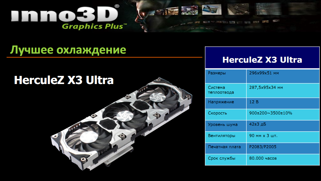 Наиболее «продвинутая» линейка — iChill, предлагает пользователю разогнанные версии карт с оригинальным дизайном охлаждения. Ряд модификаций оснащены системой водяного охлаждения, другие же могут быть подключены в уже имеющуюся СВО. Существуют также версии iChill со стандартным воздушным охлаждением, как, например, последняя модицикация воздушного кулера, получившая название HerculeZ X3 Ultra. Это модель с большим медным основанием, пятью медными тепловыми трубками, массивным алюминиевым радиатором и тремя 90-миллиметровыми вентиляторами с функцией управления скоростью вращения методом ШИМ в диапазоне от 900 до 3500 оборотов в минуту, которые для удобства очистки от пыли сделаны съемными. Система охлаждения обладает габаритами 296×99×51 мм, характеризуется максимальным уровнем шума 42 дБ, снабжена отсоединяемой подсвечиваемой панелью с фирменным логотипом (опционально можно создать собственный) и дополнена закрепленной на обратной стороне печатной платы усиливающей пластиной-радиатором.