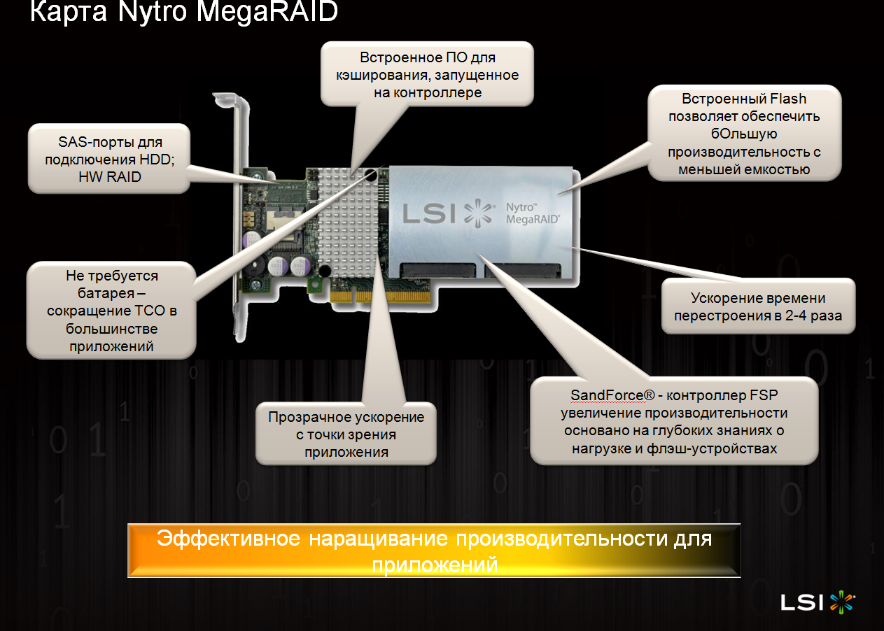 Компания продолжает инновационную деятельность, меняя подсистемы хранения в серверах по всему миру. Продуктовая линейка Nytro позволяет строить как решения на SSD, так и гибридные массивы с использованием и SSD, и HDD. Новые функции Nytro MegaRAID позволяют загружаться с SSD, смонтированных на борту контроллера и одновременно использовать их же для кэширования.
