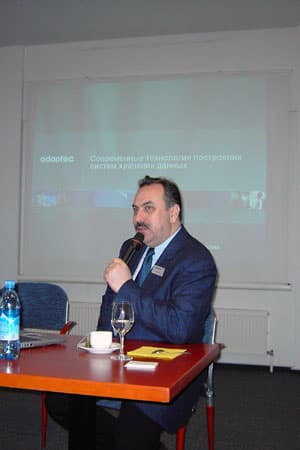 Выступление директора по развитию Adaptec было поделено на две части, первая из которых посвящалась контроллерам, вторая — системам хранения данных. Основная идея доклада заключалась в том, чтобы познакомить дилеров с современными технологиями, «чем и как живет» компания Adaptec.