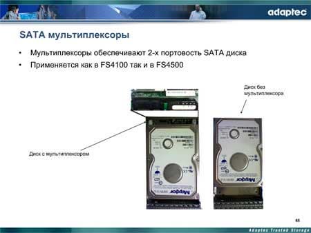 Следующие устройства, имеющиеся в свободной продаже — это продукты серии FS4500/4100 («FS» расшифровывается как «Fibre Channel/SATA»). Эти устройства максимально подходят для совместных решений, они весьма надежные по своему конструктиву. Все «внутренности» построены на идеологии Fibre Channel, но SATA-диски, как известно, являются однопортовыми. Поэтому для этих дисков применяется специальный SATA-мультиплексор (по сути, простой управляемый ключ). В результате стоимость дисков получается дороже, т. к. продается конструкция вида «каретка — мультиплексор — жесткий диск» — только так и не иначе.