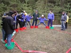 В течение дня участникам приходилось переносить всей командой по трассе теннисный мяч вот таким необычным способом