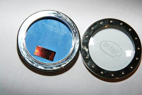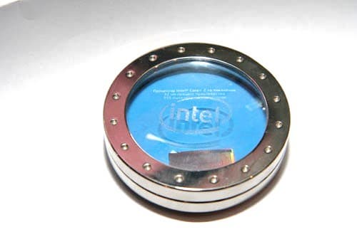 Алексей также принес на мероприятие процессорное ядро второго поколения в красивой коробке под увеличительным стеклом,