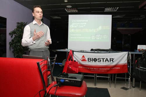 Представитель компании Intel, Алексей Рогачков, также провел небольшую презентацию, на которой рассказал о новых процессорах, некоторые из которых используются в представленной серии материнских плат компании Biostar. Специалист по развитию продукции Intel рассказал нам о том, что первой платой, поддерживающей Intel Core второго поколения, стала новая плата Biostar. Именно на ней специалисты проверили новые процессоры (даже платы самой компании Intel немного задержались).
