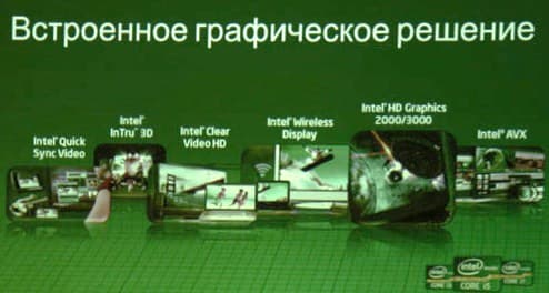 Очень много было изменено и в самой графике и ее структуре, в связи с чем производительность графической подсистемы возросла в два раза (каждый исполнительный блок может обрабатывать теперь до 8 потоков, работая на более высокой частоте). Именно поэтому теперь стало возможными использование таких новых технологий, как Intel Quick Sync Video, которая позволяет загружать в блок кодирования и декодирования видео внутри графического акселератора несвойственные ему задачи и при этом разгружать CPU при ускорении на аппаратном уровне. Еще одна технология, Intel InTru 3D, выводит стереоскопическое изображение с Blu-ray 3D-дисков вне зависимости от технологии отображения посредством порта HDMI 1.4.