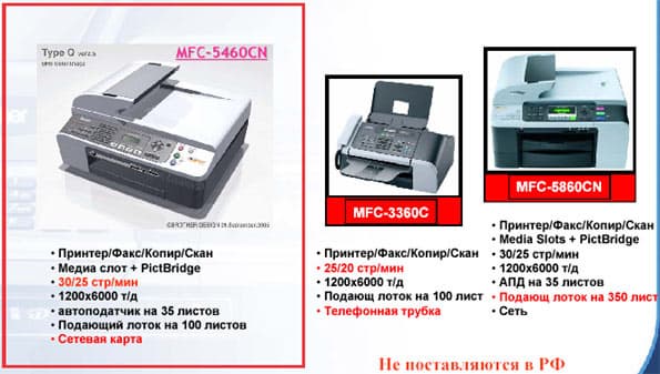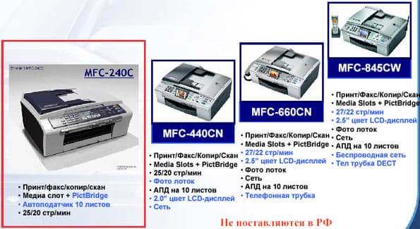 Как видно на слайде, из всей новой линейки МФУ Brother MFC в России будет представлена только модель MFC-240C. Однако здесь есть одно но. Возможно, что на рынок будет выведена и «навороченная» модель MFC-845CW, поддерживающая беспроводную связь Wi-Fi и работу с трубкой DECT. На это устройство обратило внимание местное представительство Brother, и если заказчики проявят к нему интерес, то вполне возможно будет увидеть MFC-845CW в рознице. А пока вернемся к аппарату Brother MFC-240C, вопрос о выходе которого на наш рынок уже решен.