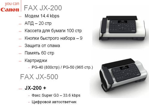 Как видно на слайде, старшая модель JX-500 оснащена более быстрым модемом и цифровым автоответчиком. Остальные параметры у новинок одинаковые: они имеют устройство автоматической подачи документов на 20 страниц, 100-страничную кассету для бумаги, 9 кнопок быстрого набора и функцию защиты от спама, — разве что у факса JX-500 еще объем памяти в два раза больше: 120 страниц против 60 страниц у JX-200.