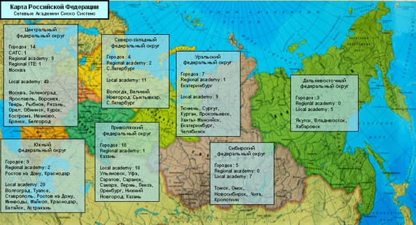 Сейчас в РФ действует 167 Сетевых академий и в ближайшие три года Cisco планирует открыть в России еще 400, в Украине открыто 65 академий, в Азербайджане — 25 и еще 70 — в других странах СНГ. Сетевые академии Cisco созданы на базе вузов, однако уже сейчас открываются Сетевые академии начального уровня в школах: в феврале 2008 года в 17 школах Юго-Восточного административного округа Москвы ученики старших классов начали обучение в Сетевых академиях Cisco, не дожидаясь перевода учебной программы на русский язык.