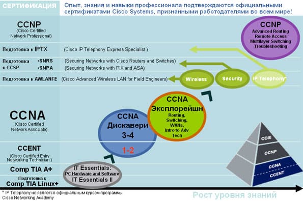 Следующая ступень образования — CCNA (Cisco Certified Network Associate). Курс, в свою очередь, делится на две части: CCNA Discovery и CCNA Exploration. Первый из них ориентирован на работу с приложениями и рассчитан на людей, которые в дальнейшем смогут инсталлировать сеть и организовать выход в нее с компьютеров. Вторая часть — предоставляет студентам возможность получения навыков инсталляции, а также конфигурирования коммутаторов и маршрутизаторов в многопротокольных сетях, объединяющих локальные и территориально-распределенные сети (LAN и WAN), поиска и устранения неполадок в сети, повышения производительности и защищенности сети.