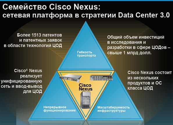 В основе концепции Data Center 3.0 лежит сетевая платформа Cisco Nexus, которая разрабатывалась на протяжении четырех лет коллективом, состоявшим из более чем 500 ведущих инженеров компании. В процессе разработки Cisco подала более полутора тысяч патентных заявок и свыше пятисот из них было зарегистрировано.