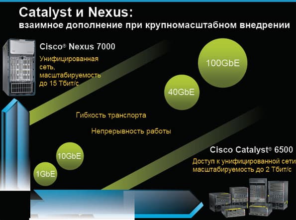 Сетевая платформа Cisco Nexus 7000 для ЦОД разработана для поддержки новых требований: виртуализации, сетевых приложений, работающих в режиме реального времени, видеоуслуг и технологий групповой работы. Это первая в отрасли платформа с унифицированной коммутационной матрицей, избавляющая от необходимости строить две параллельные сети: одну для передачи данных, другую — для их хранения. Благодаря этому упрощается кабельная разводка и коммутационная инфраструктура.