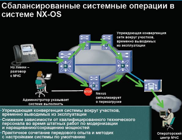NX-OS позволяет обновлять версии ПО, не прерывая доставки услуг, что значительно сокращает время простоев. Функции автоматической диагностики постоянно отслеживают работу всех программных компонентов ОС. При обнаружении сбоя происходит перезапуск NX-OS с учетом текущего состояния без прекращения доставки услуг. Модульный дизайн операционной системы дает возможность изолировать сбои и выполнять процедуры автоматического восстановления в удаленном режиме без вмешательства человека.