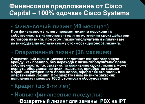 Cisco осознаёт, что её продукты при отличной функциональности также отменно дороги, и предлагает через свою дочернюю фирму разнообразные услуги кредита и лизинга, способные помочь во внедрении продуктов компании при ограниченном (в основном по времени) бюджете.